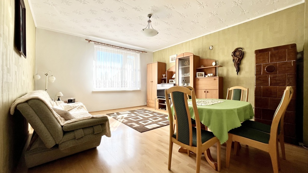W salonie oryginalny piec kaflowy z możliwością wymiany na kominek.