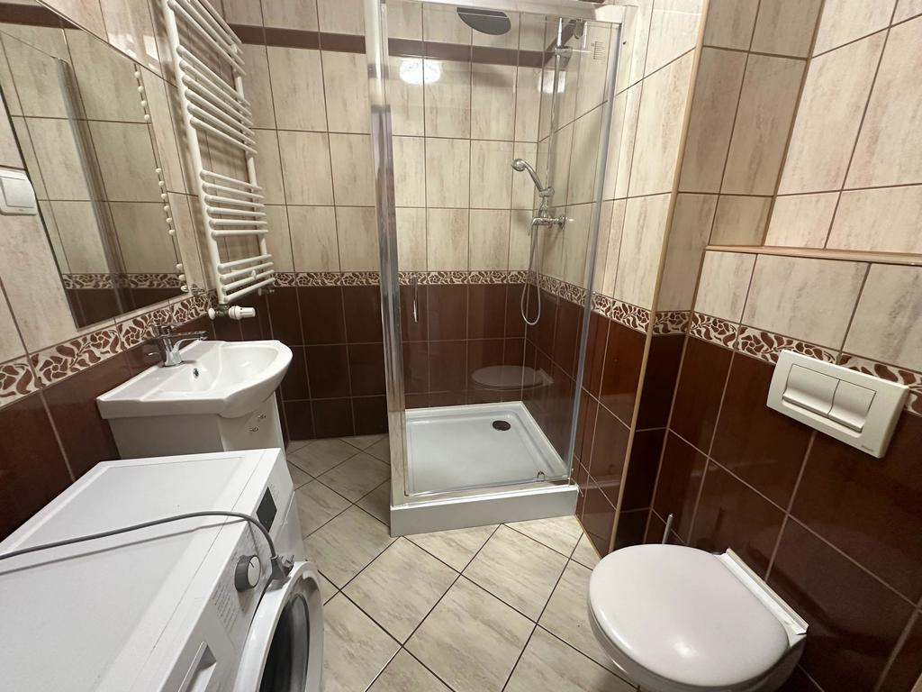 Łazienka z kabiną natryskową - wyłożona glazurą, terakotą wyposażona w pralkę.