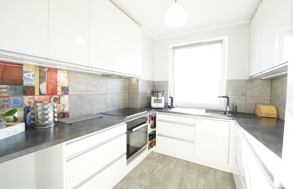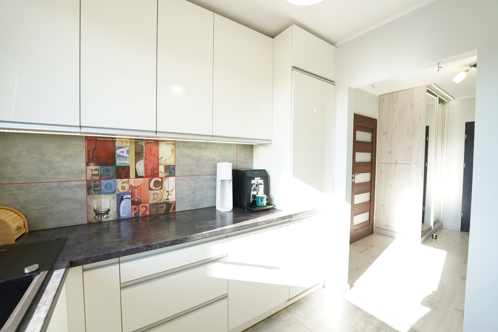 W kuchni zamontowane zostały nowoczesne meble pod wymiar wraz ze sprzętem AGD. Meble na wysoki połysk ożywiają i powiększają wnętrze.
