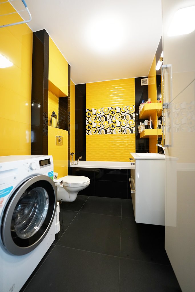 W łazience znajduje się wanna, umywalka, toaleta oraz pralka.