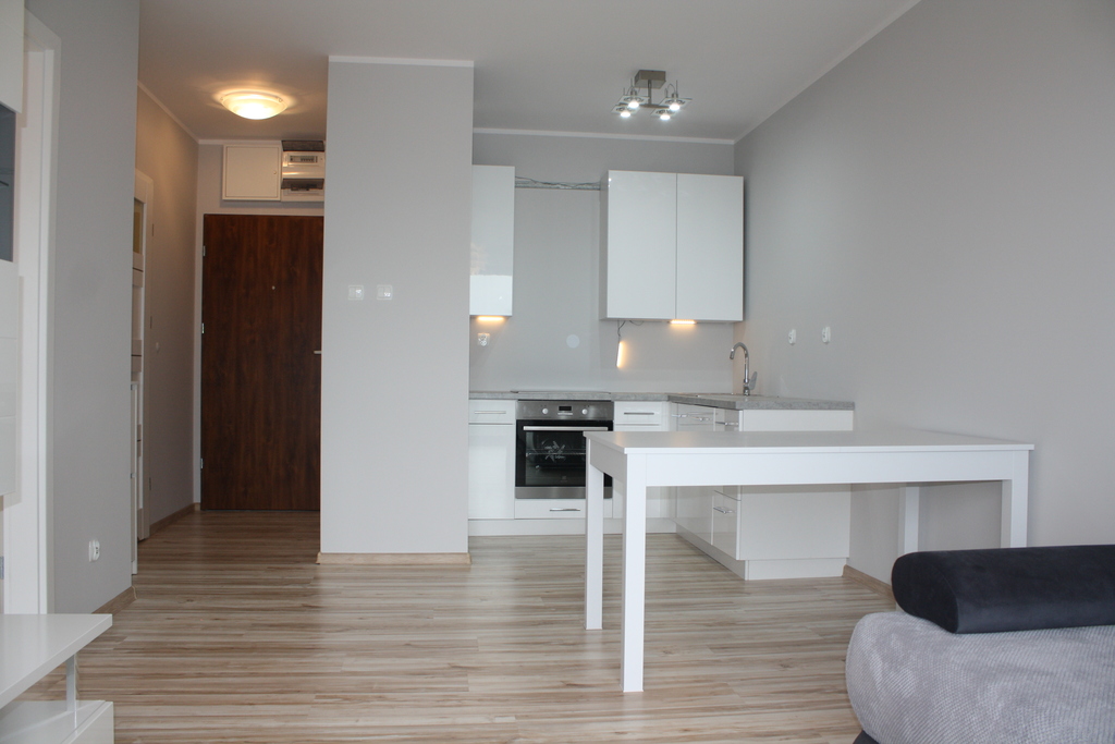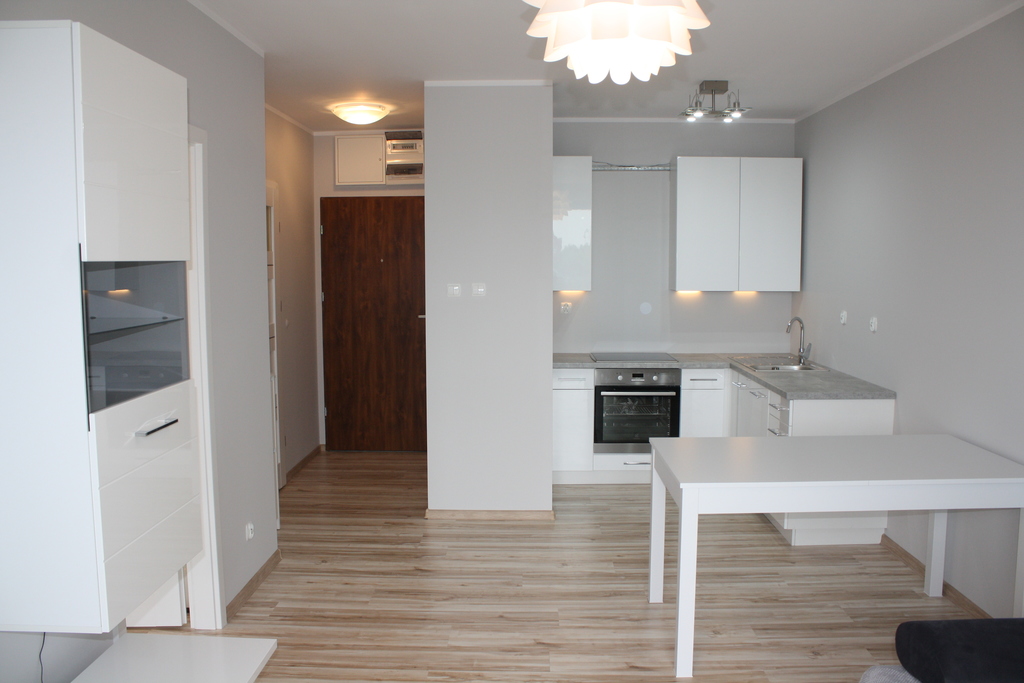 We offer to rent a 2-room apartment in a modern building at Głowackiego Street in Szczecin. The property is located on the third floor, has a big balcony and is currently ready to move in. The building was constructed in 2016 and has an elevator. In front of the building, or in the backyard, there is a parking. Near are also shops (Netto, Fresh), small shopping mall and some services. Nice infrastructure, modern style of the building and international neighborhood are the advantages of this location. The apartment is finished in a modern style , fully furnished and equipped (washing machine, refrigerator, microwave oven, dishwasher).