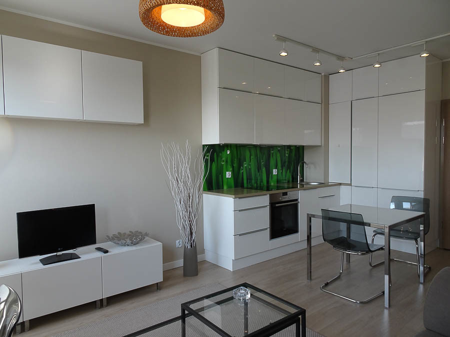 A furnished elegant apartment on the 6th floor of an apartment building from 2012 for rent. Fully furnished. In a room with a kitchenette with an area of 22 m2: a table with a glass top, 3 chairs, a gray sofa, TV table, TV, coffee table, desk, two-door wardrobe. In the kitchenette, modern furniture and household appliances (SIMENS 45 cm dishwasher, fridge with freezer (3 drawers), electric and ceramic hob). Bedroom 8.58 m2 with a two-door wardrobe 1.20 m long, mirror in a white frame, ironing board, bedding, bed 1.30 m wide. In the bathroom, a 6.16 m2 shower cubicle, a washbasin with a cupboard, a white wardrobe, a SIEMENS washing machine, a dryer. The apartment is fully equipped: PHILIPS iron, BOSCH vacuum cleaner, COFFEE WARERTON electric kettle, pots, frying pan, Cousine heat-resistant dish, a set of plates and cups, cutlery. Cost: PLN 2,500 + PLN 550 of average monthly fees to the administrator, including electricity, heating and water consumption. Location close to the city center. There is a concierge in the building, a silent elevator.