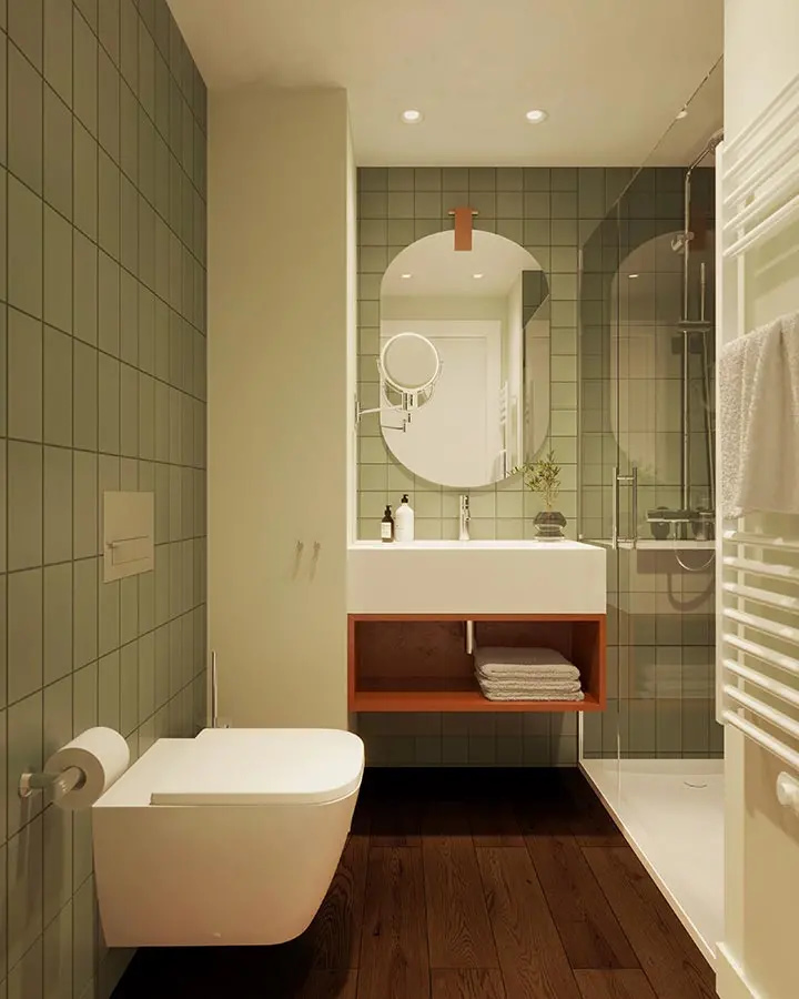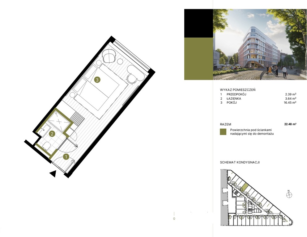 apartament 1 pokojowy z łazienką, przedpokojem o łącznej powierzchni 22,48 m2, na II piętrze, z ekspozycją okien północny-wschód.