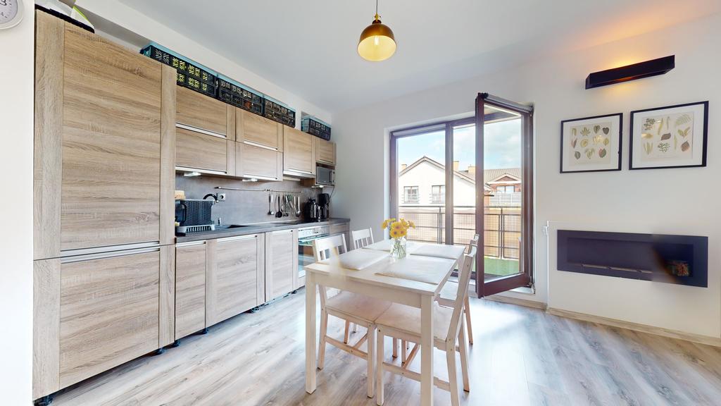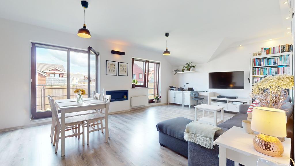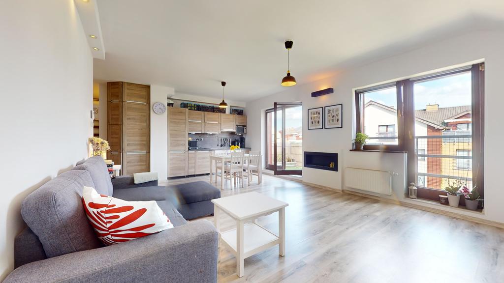 - przestronnego salonu z aneksem kuchennym, z którego jest wyjście na duży balkon,