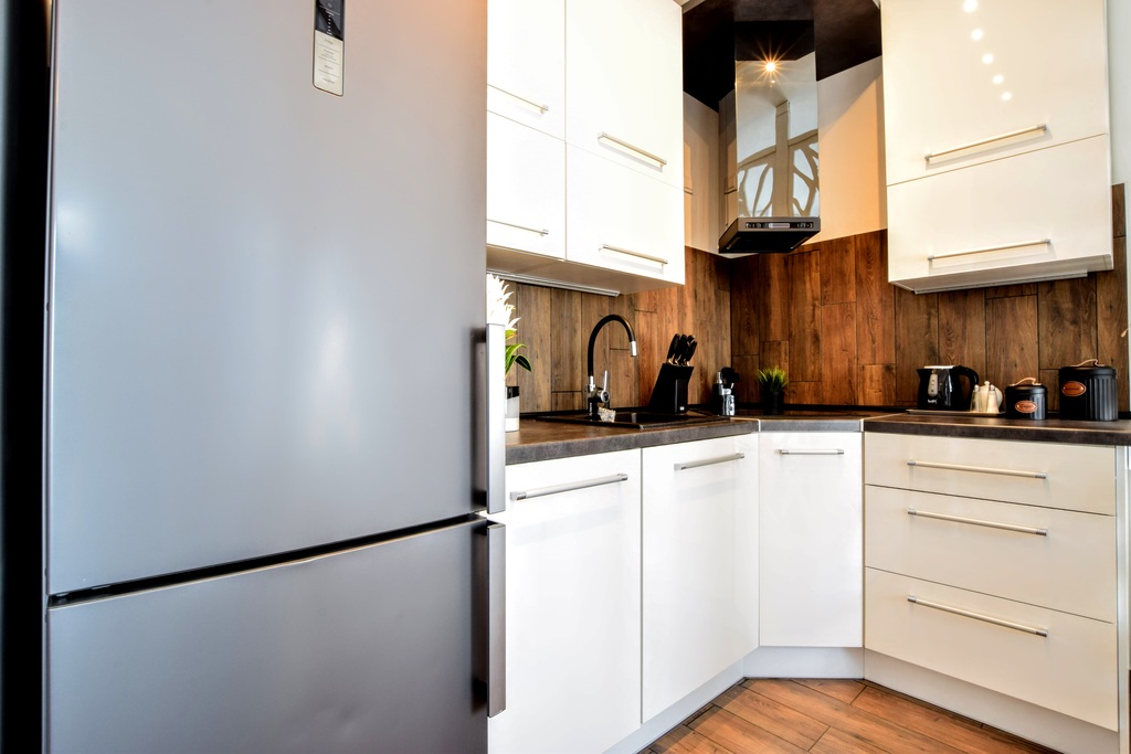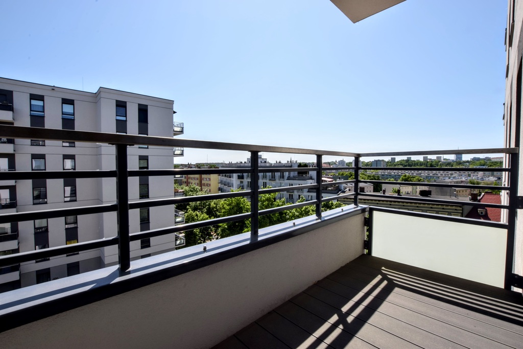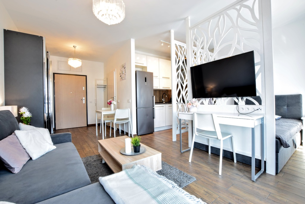 -salon z aneksem kuchennym oraz wyjściem na balkon,