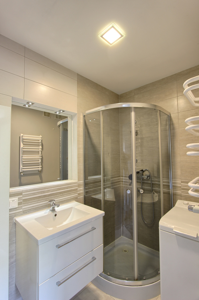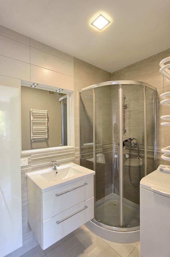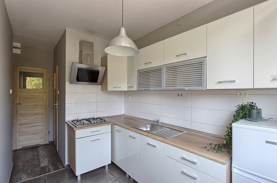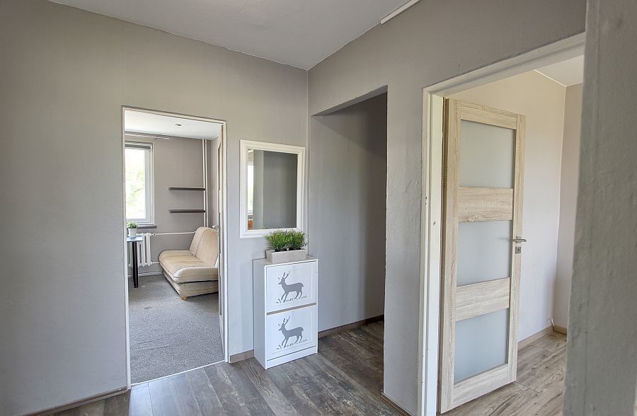 Na podłogach w pokojach panele, w kuchni i łazience kafle.