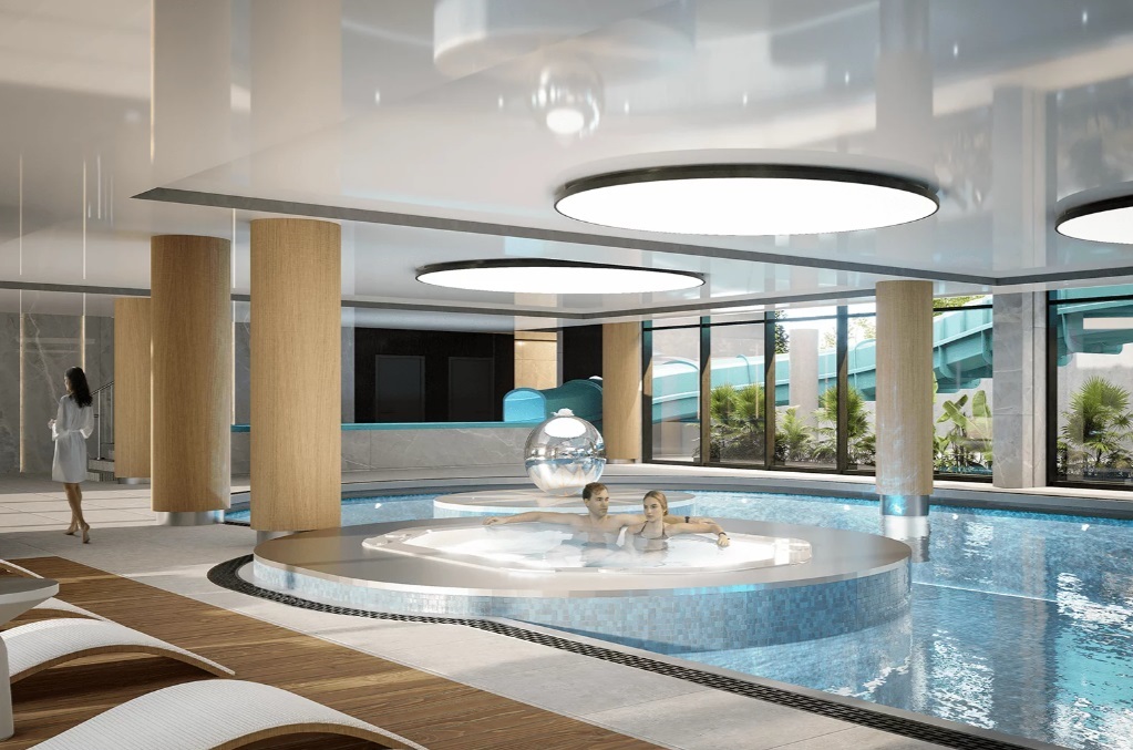W obiekcie znajdować się będzie komfortowa strefa wellness z basenem zewnętrznym, jacuzzi i drink barem. Strefa basenowa ze zjeżdżalniami to raj dla dzieci, brodzik z wodnymi atrakcjami oraz spray park.