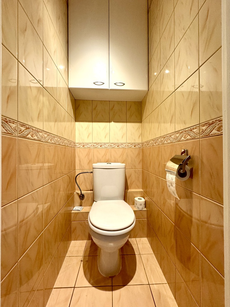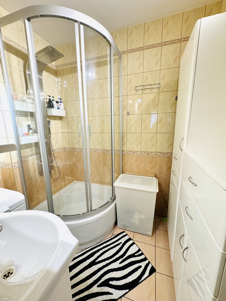 - Łazienka w glazurze i terakocie, wyposażona w prysznic i pralkę,