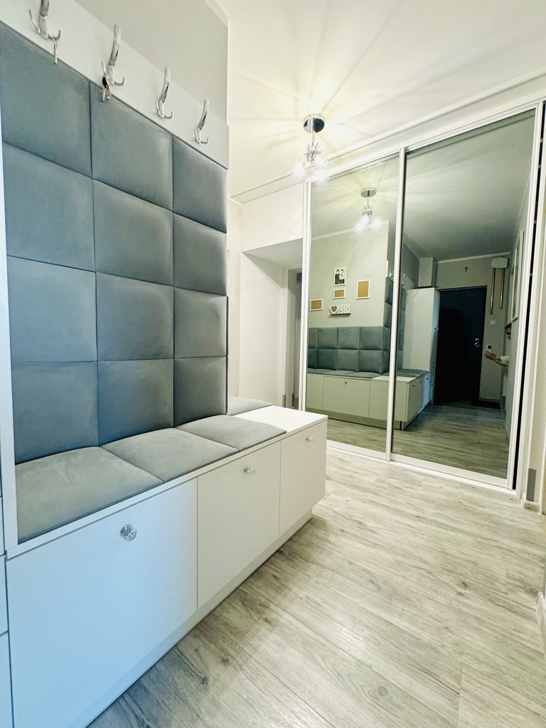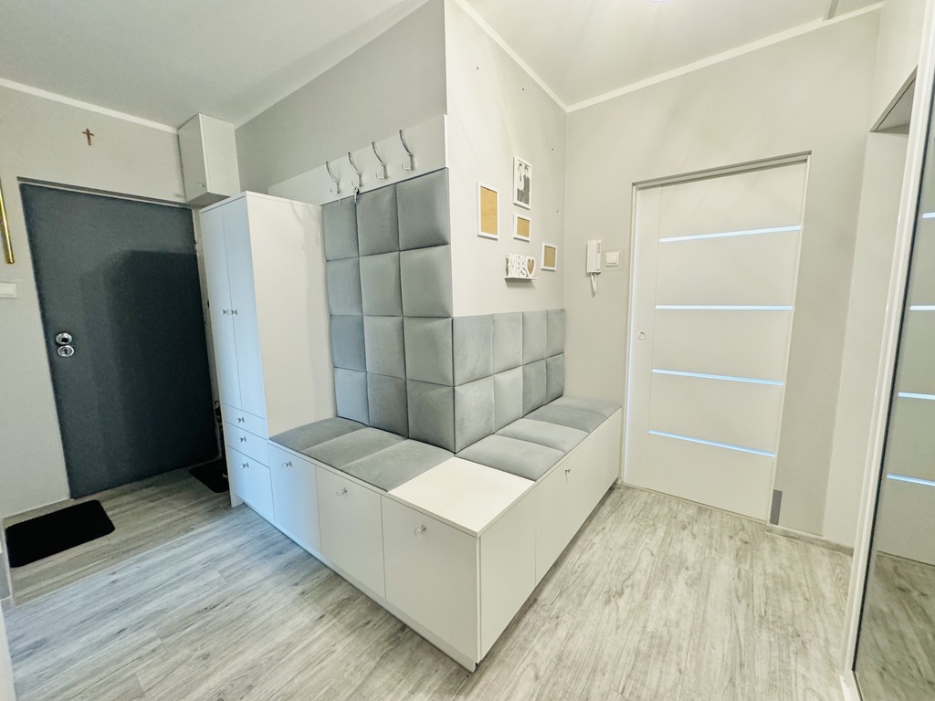 - Wejście do pokoi poprzedza przestronny przedpokój, z pojemnymi szafkami i siedziskiem,