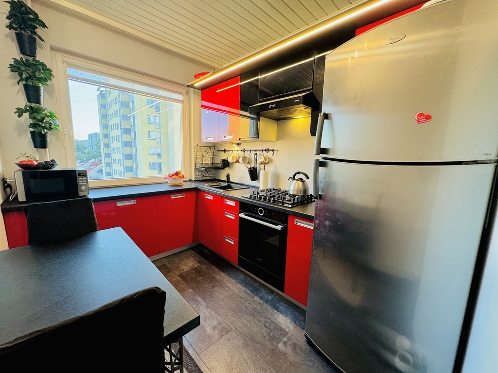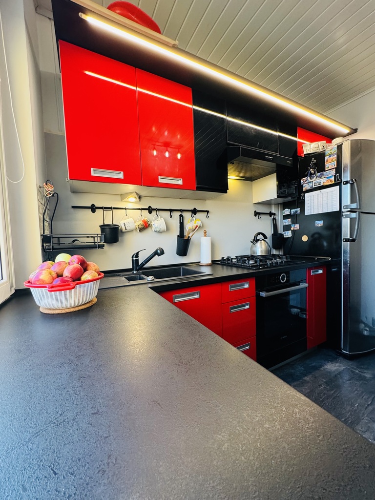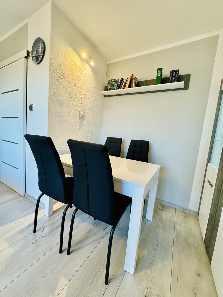 - Kuchnia widna i wyposażona w meble w zabudowie wraz ze sprzętem agd, z miejscem do spożywania posiłków.