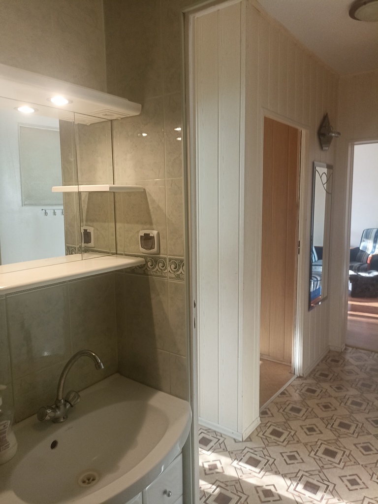 Łazienka w glazurze i terakocie, armatura do wymiany; piony wodno-kanalizacyjne i instalacja elektryczna nowa.