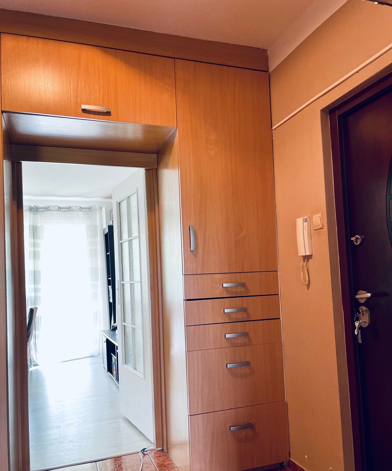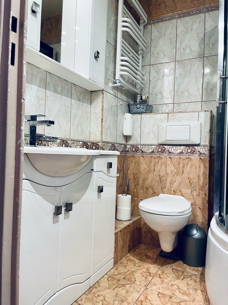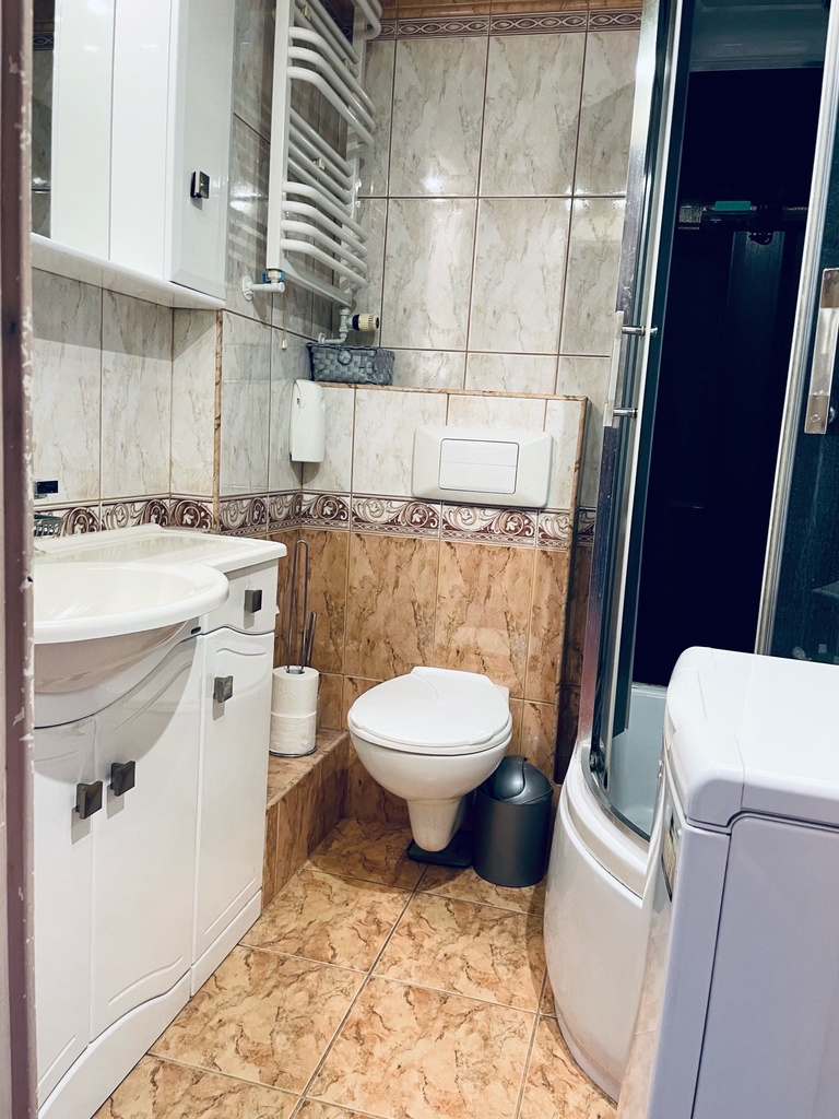 Łazienka jest wyposażona w kabinę prysznicową, umywalkę i wc. W mieszkaniu znajdują się także przestronne szafy wnękowe, które pomieszczą wszystkie potrzebne rzeczy.
