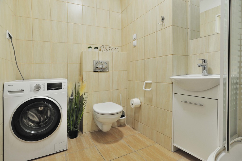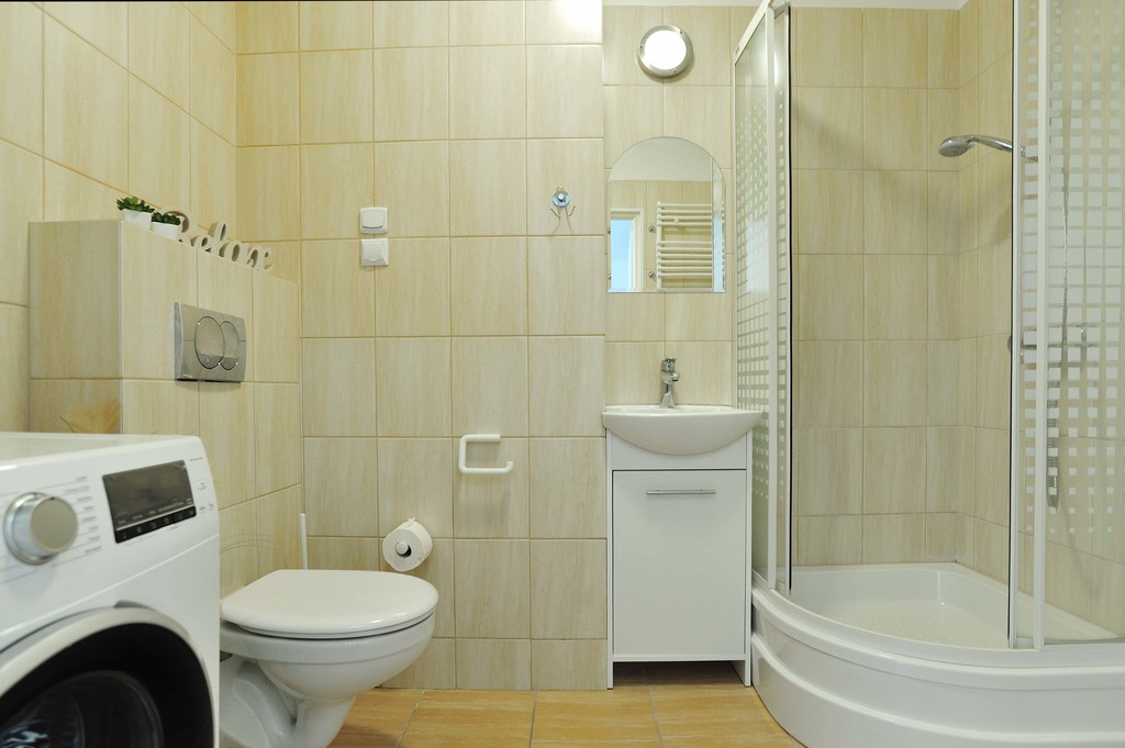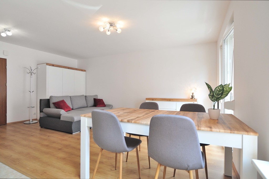 OPIS MIESZKANIA: Do wynajęcie mieszkanie znajdujące się na pierwszym piętrze II-piętrowego bloku. Całkowita powierzchnia kawalerki wynosi 32,8 m2, jest w pełni umeblowana i wyposażona. Ogrzewanie i ciepła woda z sieci miejskiej. W mieszkaniu znajduje się pokój z aneksem kuchennym i łazienka z WC. Łazienka wyposażona jest w kabinę prysznicową, WC, umywalkę, pralkę, grzejnik drabinkowy. Kuchnia jest umeblowana i wyposażona w sprzęt AGD - płytę indukcyjną, piekarnik elektryczny, lodówko - zamrażarkę, pochłaniacz. Przy drzwiach wejściowych znajduje się stojący wieszak na odzież wierzchnią oraz pojemna szafa na ubrania. W pokoju jest rozkładany narożnik, dwa stoliki kawowe, stół z czterema krzesłami, komoda, na której stoi lampka. Stąd jest też wyjście na balkon, gdzie znajduje się stół z dwoma krzesłami.