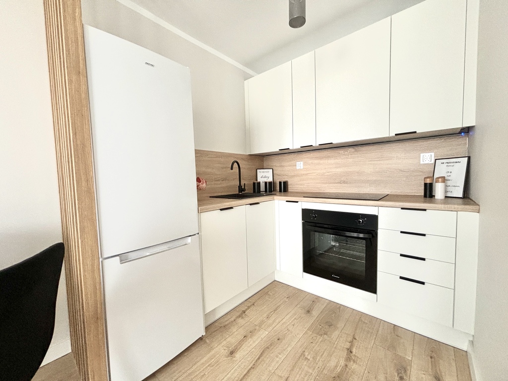 - Pokój połączony z aneksem kuchennym wyposażonym w niezbędne sprzęty AGD,