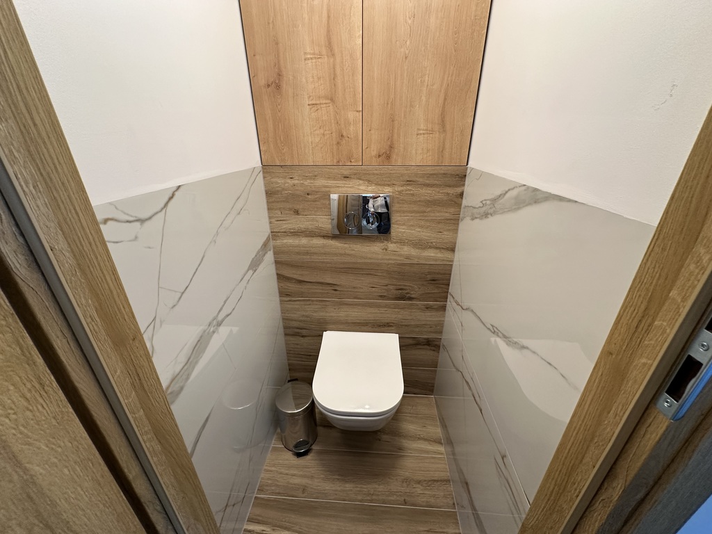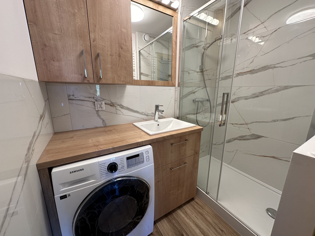Ściany w mieszkaniu głodzone i pomalowane, okna PCV. Kuchnia wyposażona w meble kuchenne, sprzęty AGD lodówka, kuchenka, okap, zmywarka łazienka z pralko-suszarką.