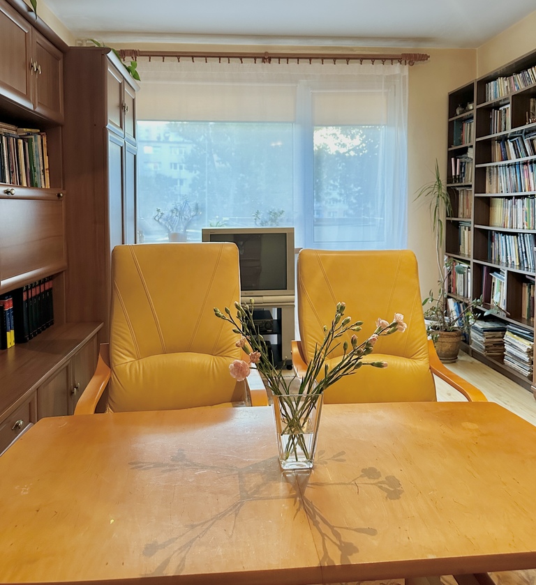 - 2 pokoje – bardzo ustawne, jasne, z ekspozycją na zachód. Na podłogach jasne panele.