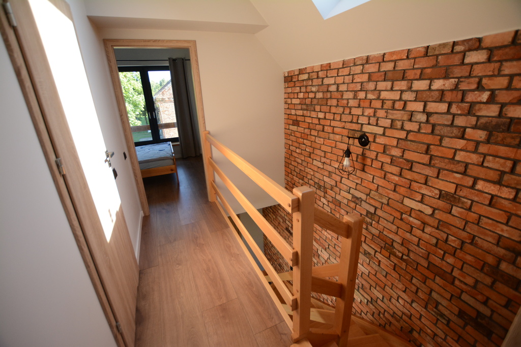 - na elewacji cegła rozbiórkowa, cięta