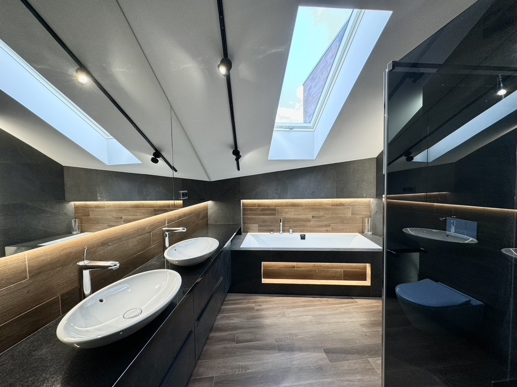 - łazienka z oknem (wyposażona w wannę i kabinę prysznicową),