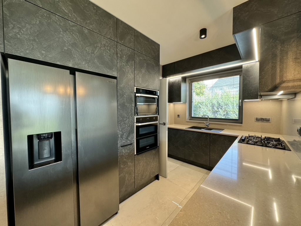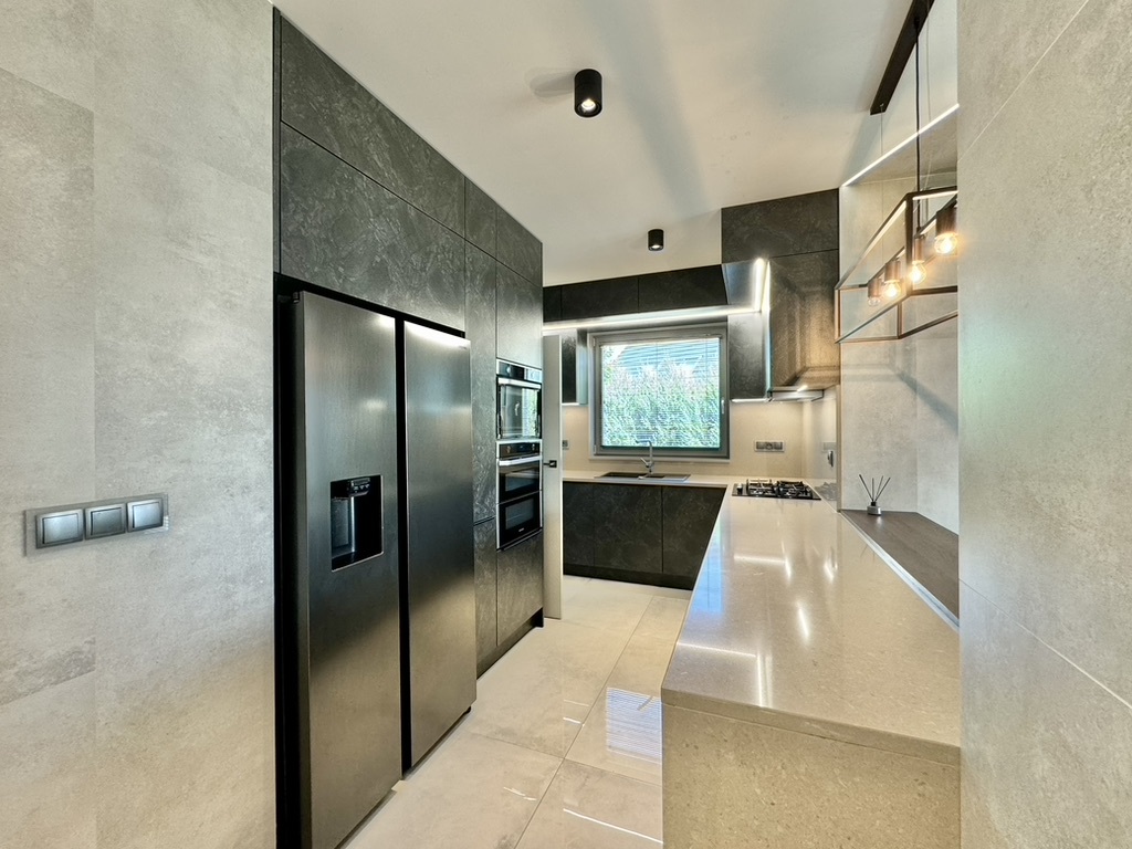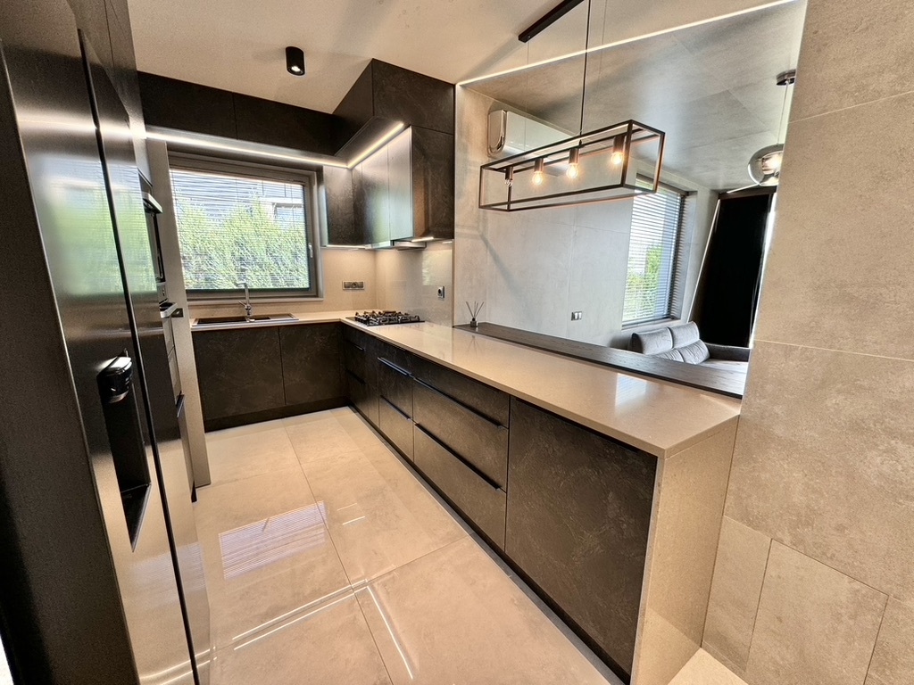 Kuchnia w eleganckiej zabudowie, wyposażona we wszystkie niezbędne sprzęty.