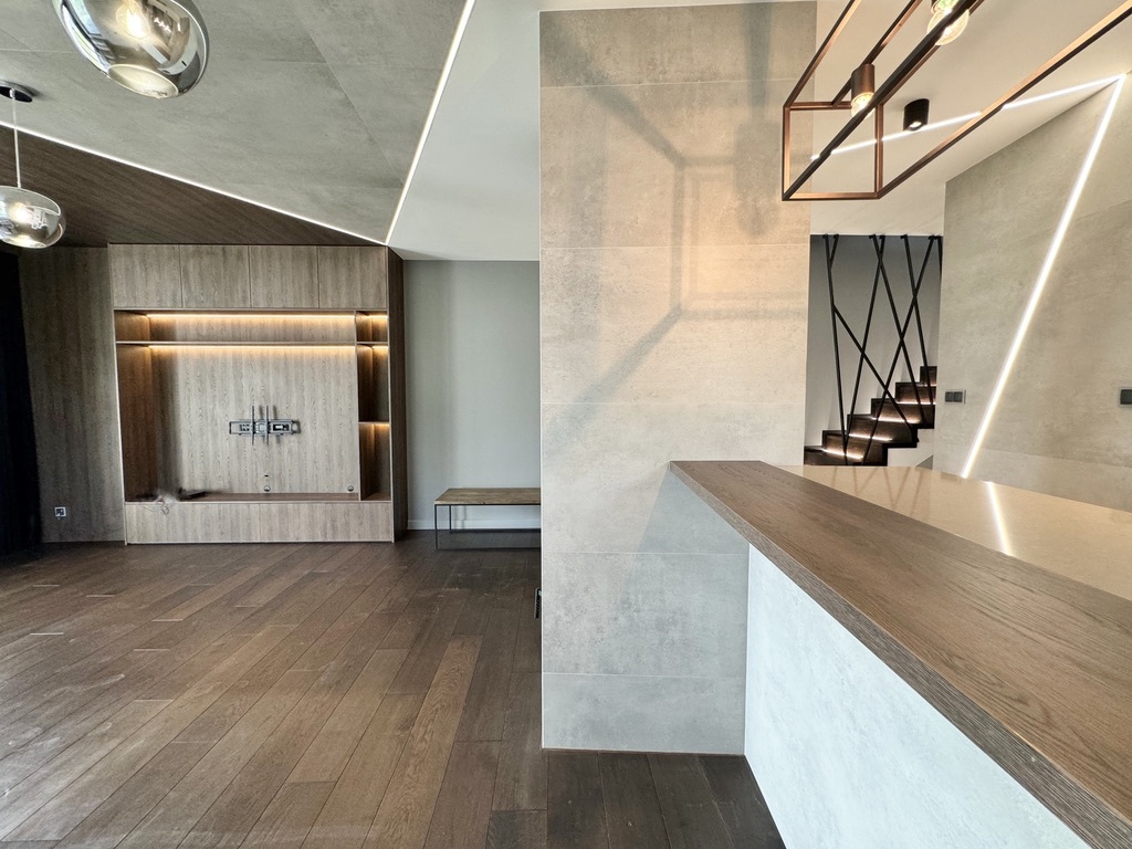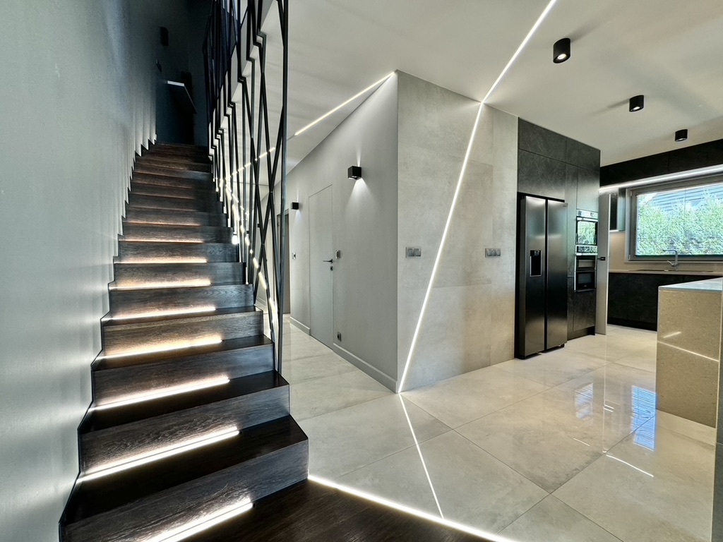 W lokalu bardzo dużo nowoczesnych elementów np. metaloplastyka czy oświetlenie, które stanowią np. listwy ledowe pod schodami, na ścianach i sufitach, a także oświetlenie punktowe.