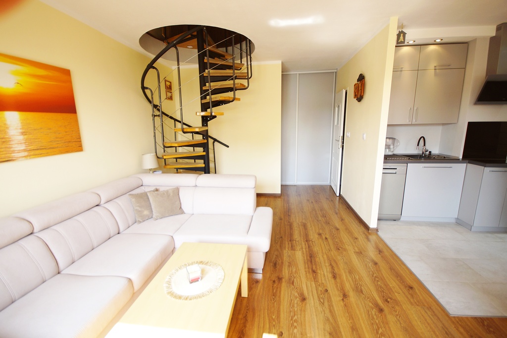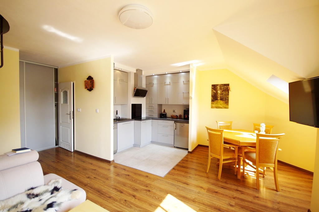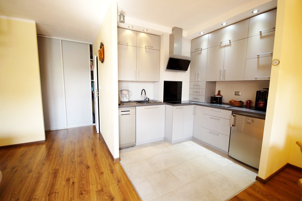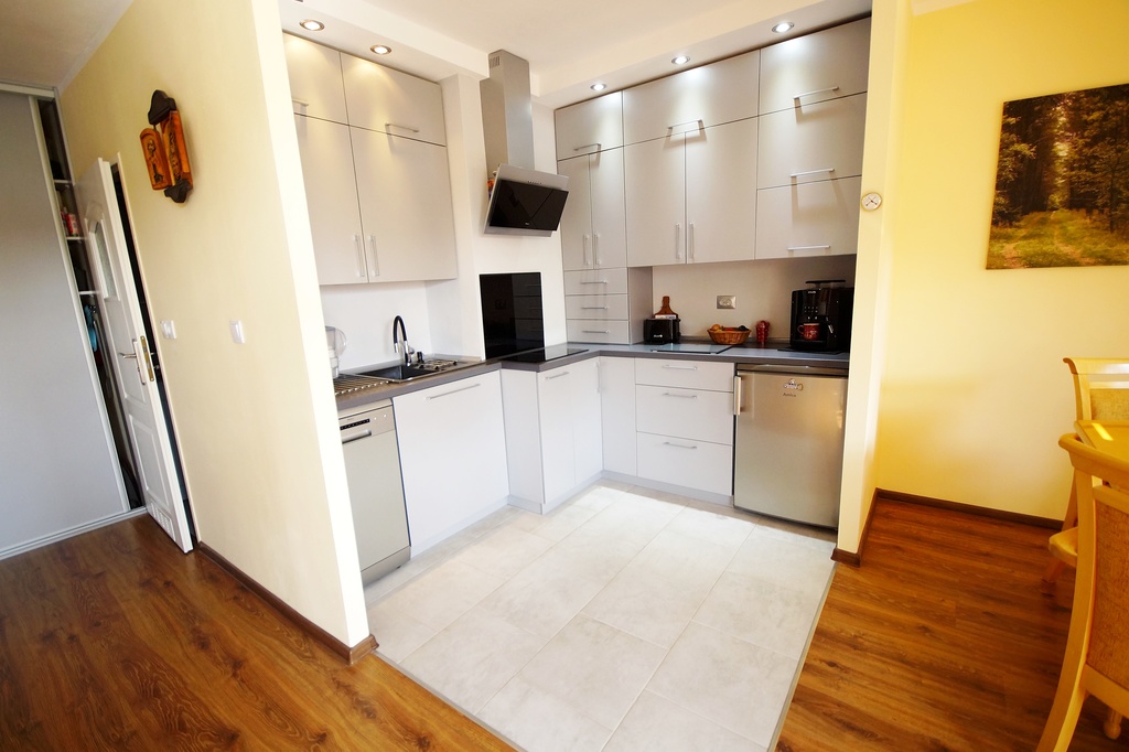 Mieszkanie wyposażone w jest w meble kuchenne. W cenie apartamentu pozostaje następujący sprzęt AGD: Lodówka "Amica", kuchenka mikrofalowa, piekarnik Hoffen, toster, płyta indukcyjna, okap, ekspres ciśnieniowy do kawy.