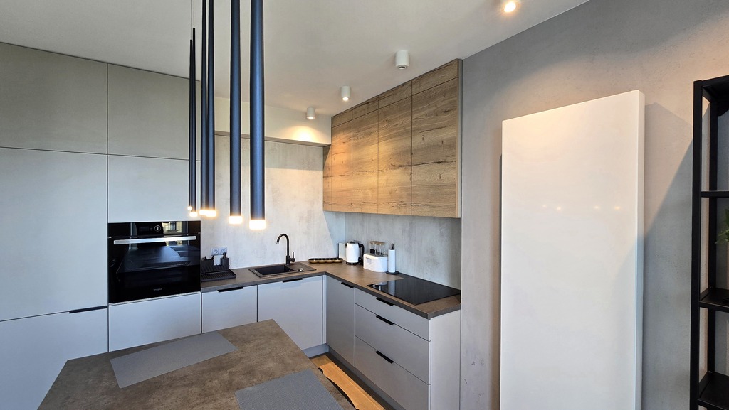 Nowocześnie urządzony salon z sofą. Jasna kuchnia wyposażona we wszelkie urządzenia AGD.