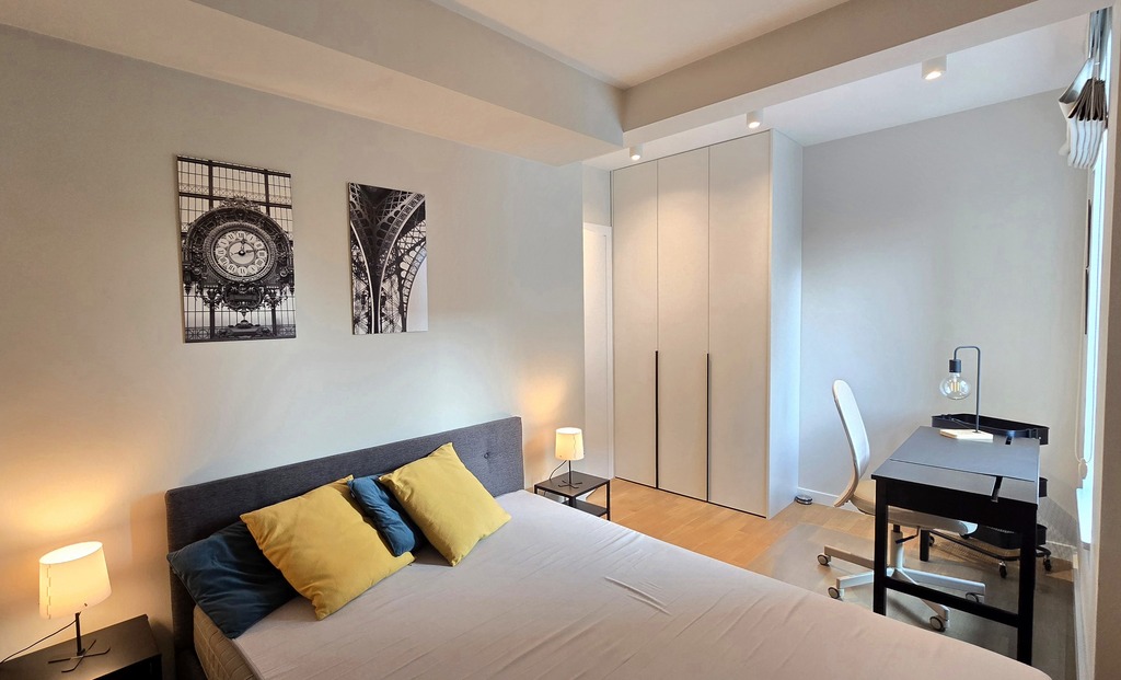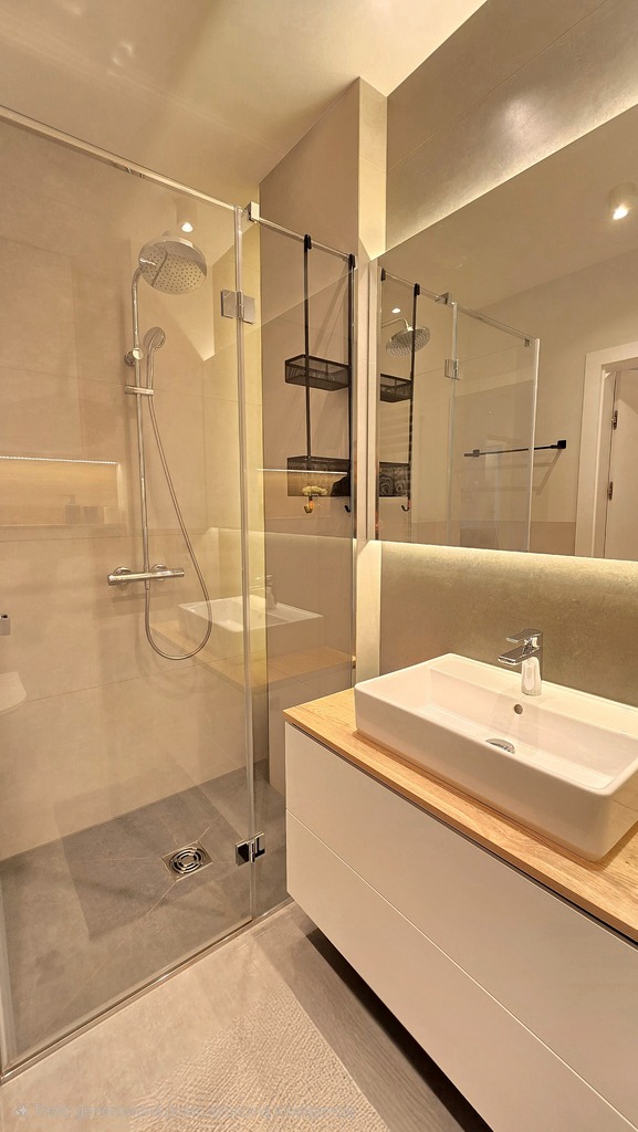 Sypialnia z szerokim dwuosobowym łóżkiem, pojemną szafa w zabudowie oraz biurko. Przestronna łazienka z dużą, wygodną kabina prysznicowa.