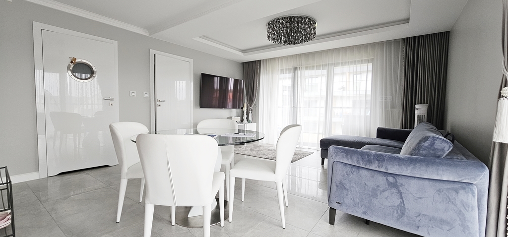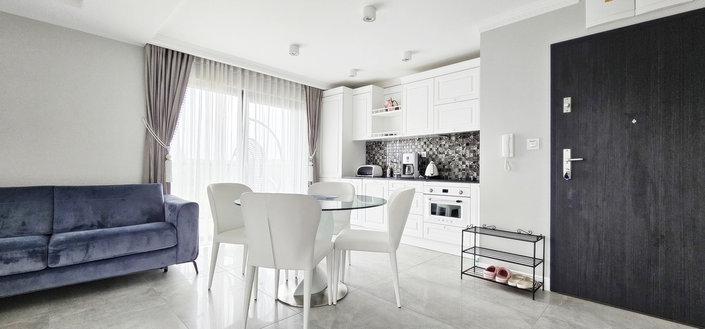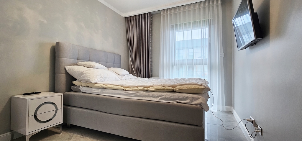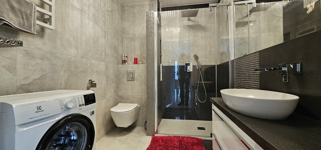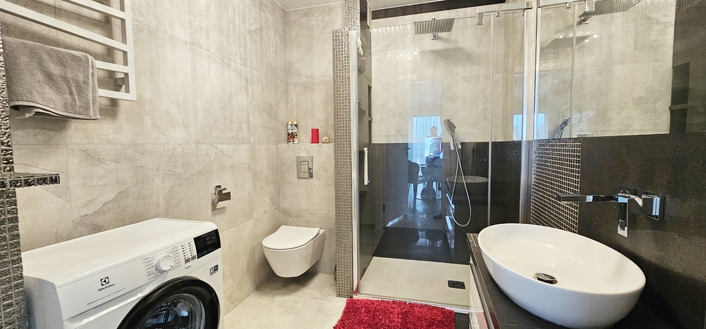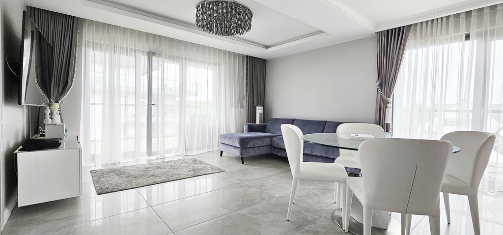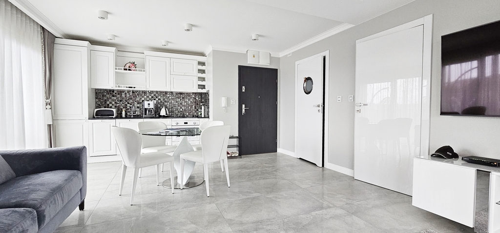 Apartament jest nowocześnie wykończony, z przestronną łazienką oraz kompletnie wyposażonym i umeblowanym aneksem kuchennym .