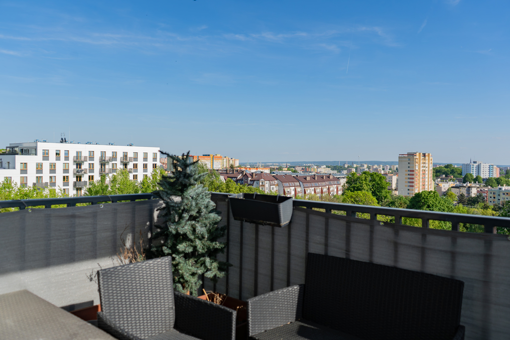 Mieszkanie posiada balkon z widokiem na panoramę miasta.