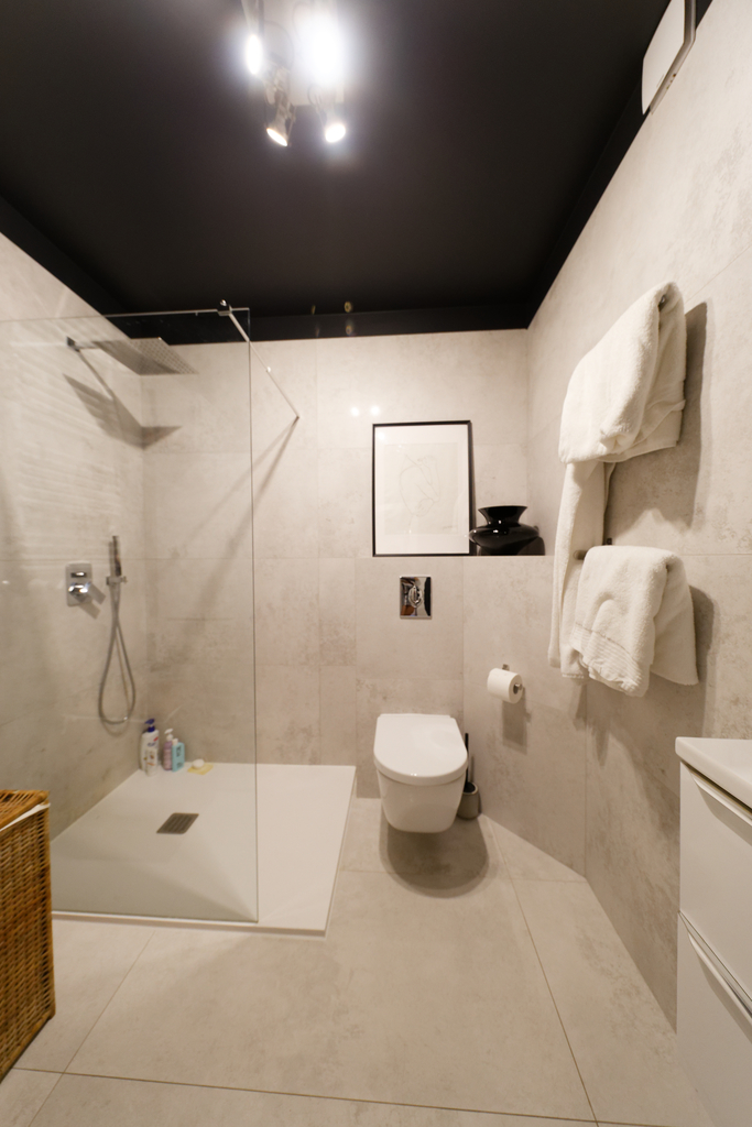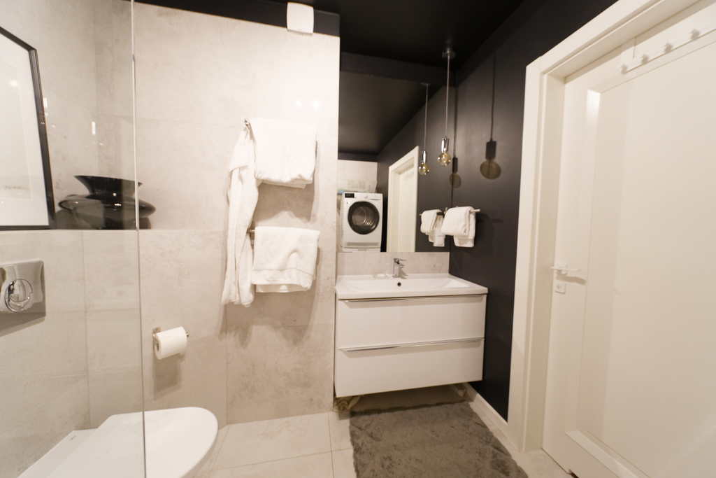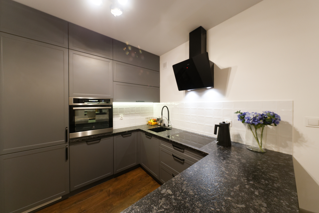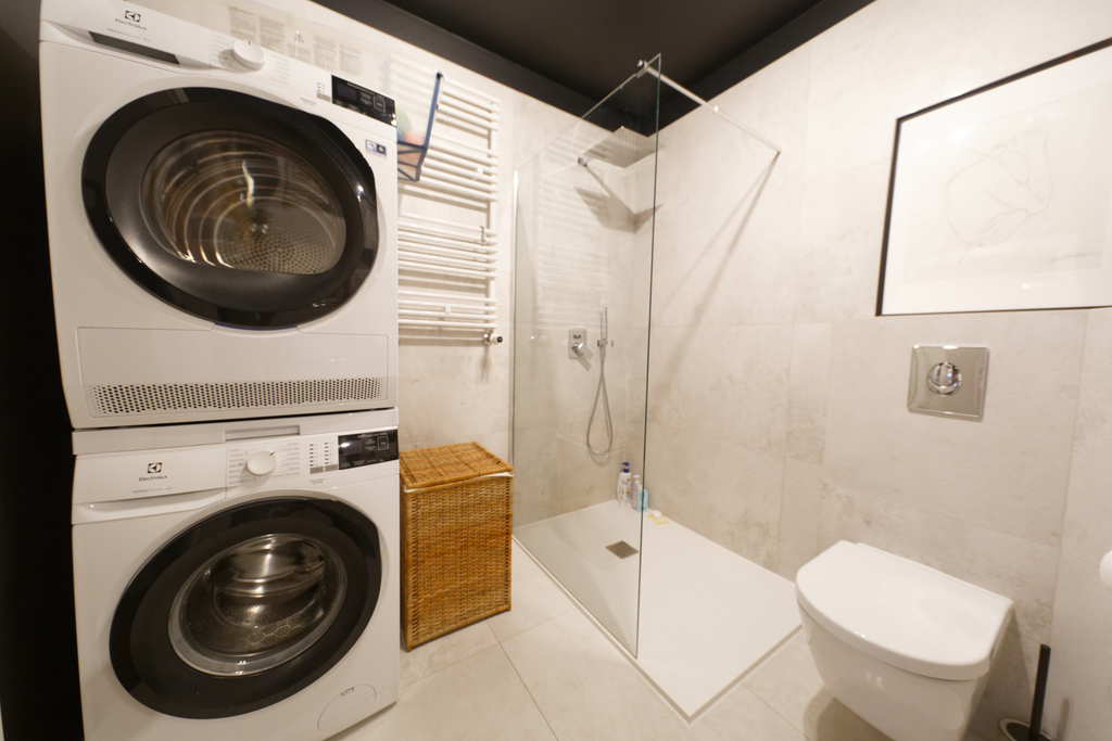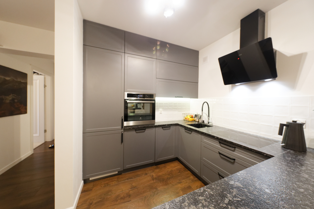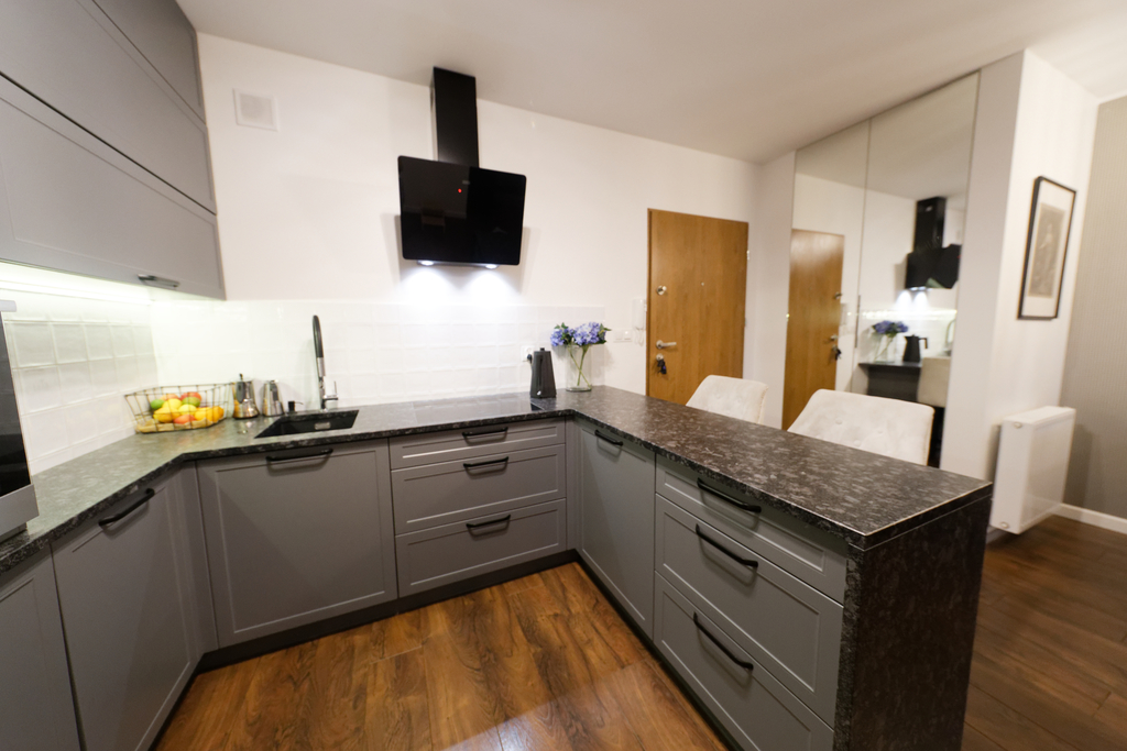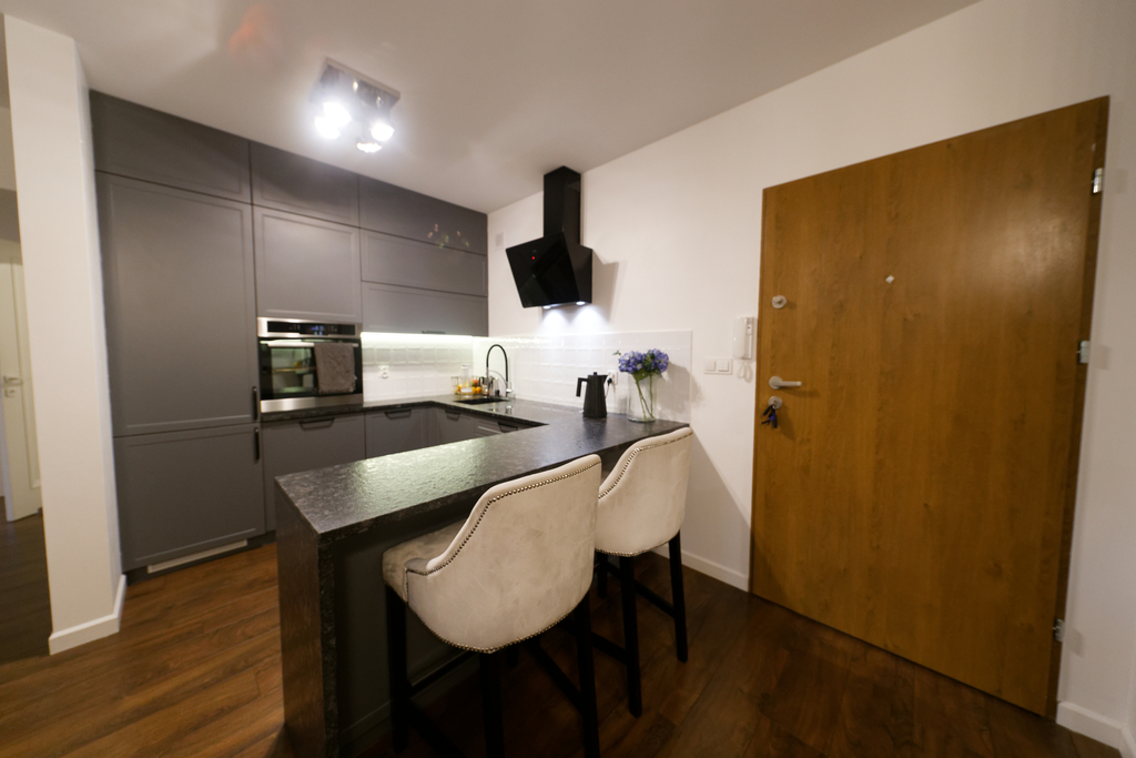 Kuchnia w pełni wyposażona – nowoczesna zabudowa wykonana na zamówienie, hokery oraz granitowy blat. Na wyposażeniu: lodówka, piekarnik, zmywarka, płyta indukcyjna zlicowana z blatem i zlew marki Franke.