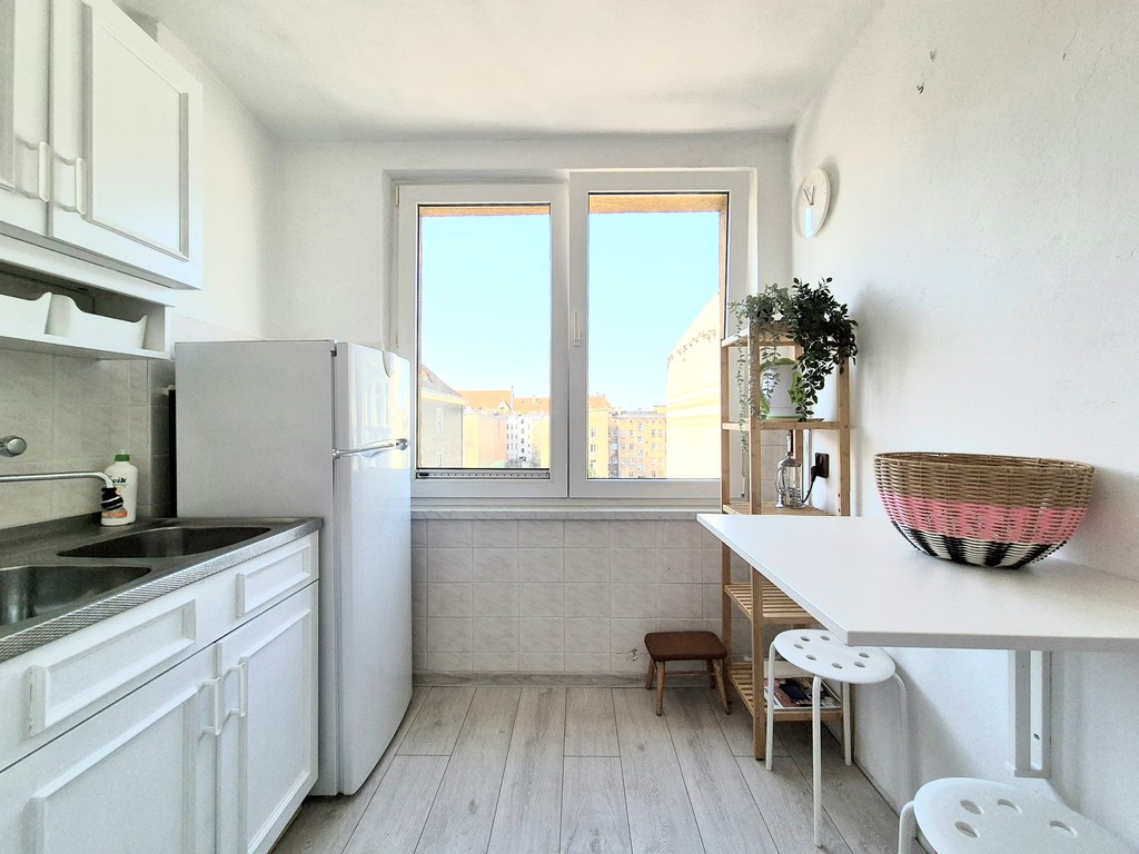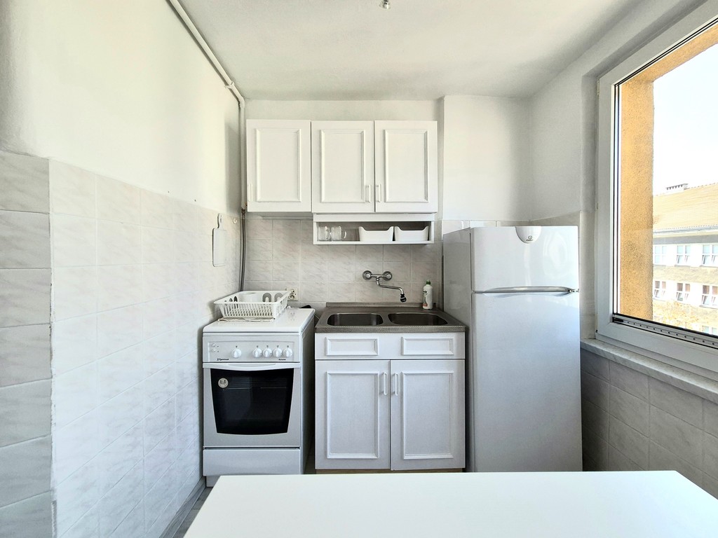 * widna, jasna kuchnia wyposażona w gazową kuchenkę, lodówkę, czajnik i podstawowe akcesoria kuchenne