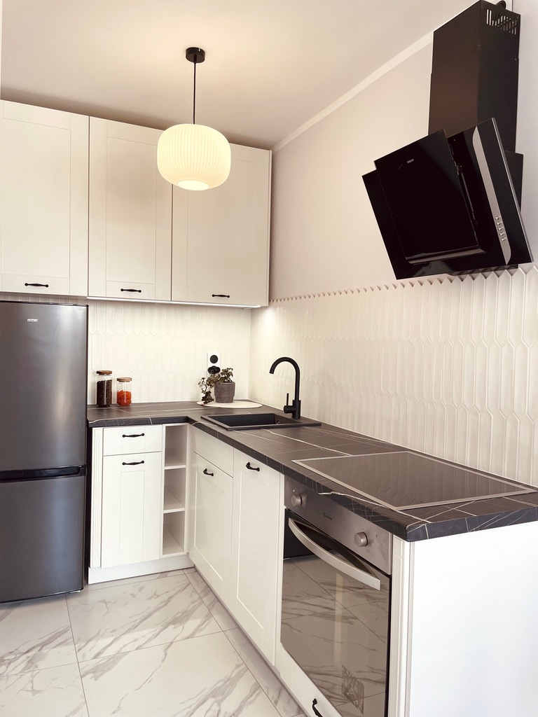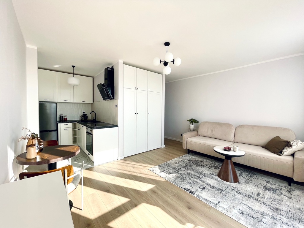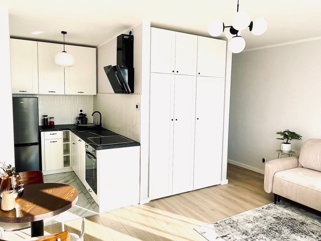 Kuchnia (3,9 m²): w pełni wyposażona w niezbędne sprzęty AGD, które pozostają w cenie mieszkania.