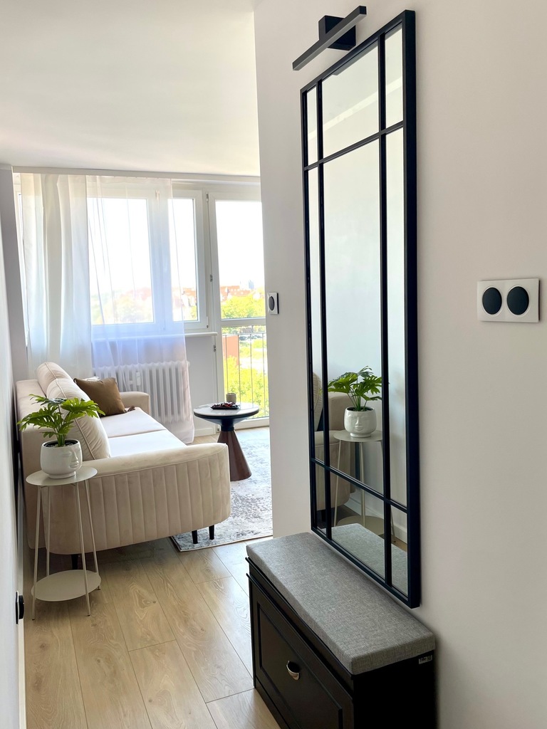 W mieszkaniu położono nowe panele, wygładzono i pomalowano ściany, a łazienka została nowocześnie zaaranżowana.