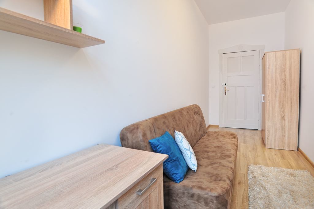 Pokój jest wyposażony w wygodną kanapę, szafę, biurko, lampkę.