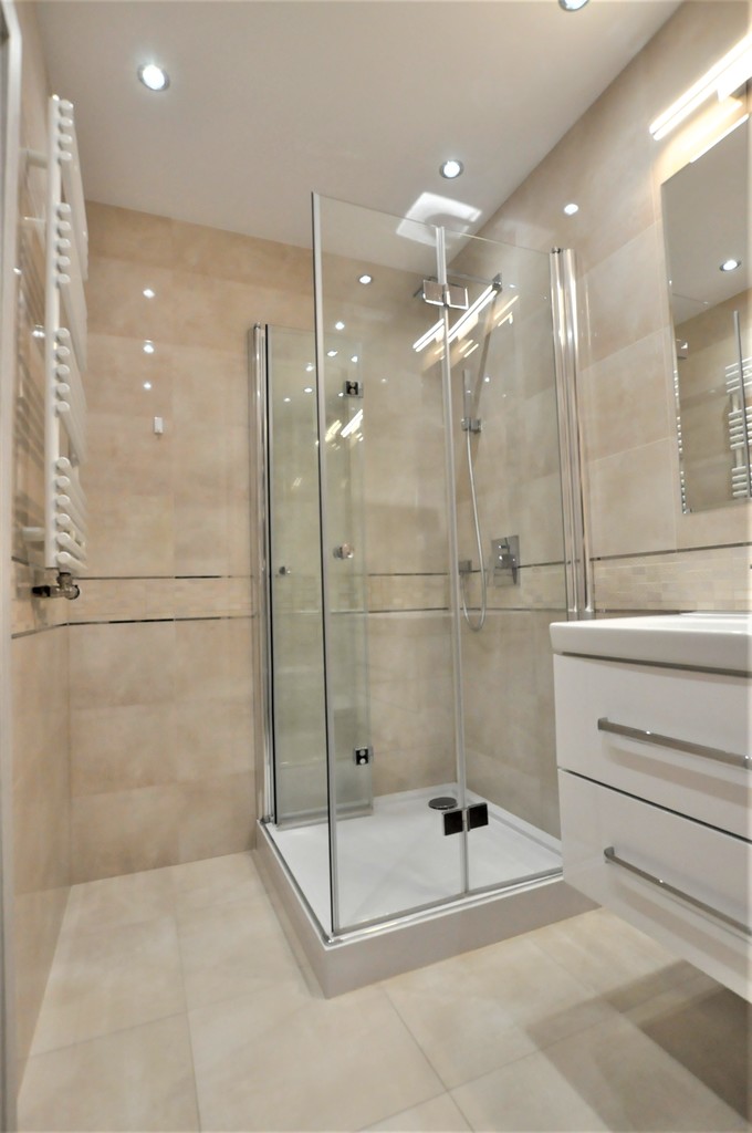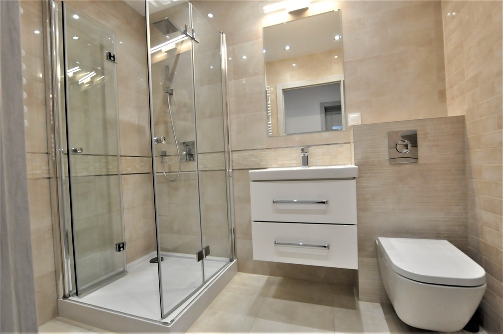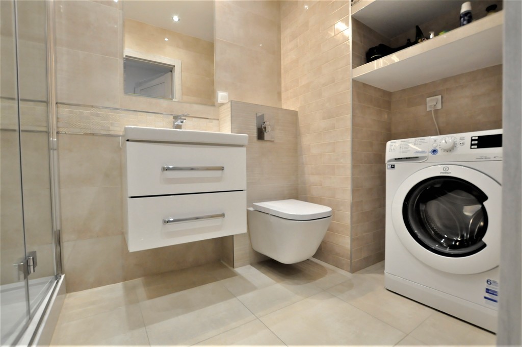 * Łazienka z kabiną prysznicową, toaletą oraz pralką w nowoczesnej glazurze.