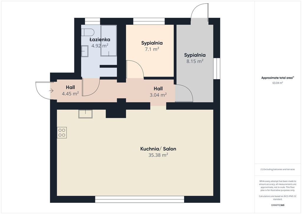 Na powierzchnię użytkową 62 m2 składają się: