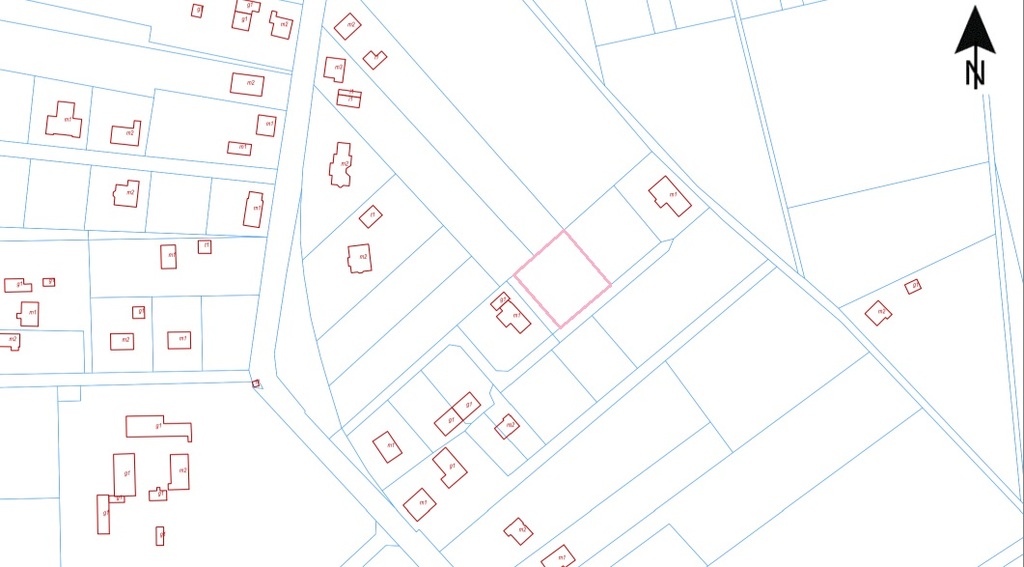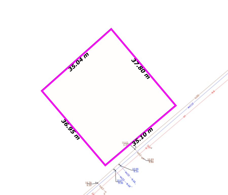 Działka w kwadracie, o wymiarach ok. 35 metrów szerokości i 37,5 metrów długości. Brak planu miejscowego. Działka objęta studium uwarunkowań