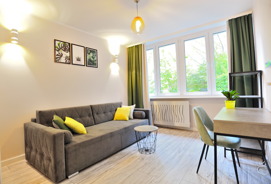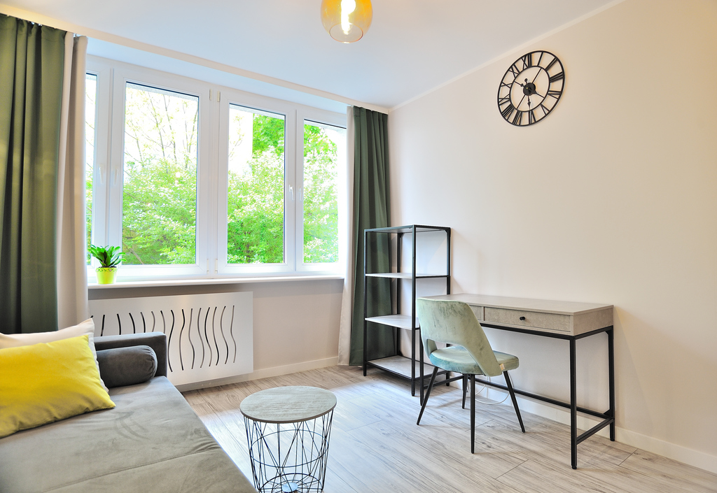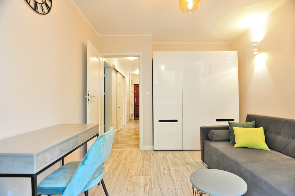 Mieszkanie jest po generalnym remoncie, wszystkie meble i sprzęty AGD są nowe. Mieszkanie składa się z 3 niezależnych pokoi, korytarza, kuchni, łazienki z WC. W pokoju znajduje się rozkładana kanapa, biurko z krzesłem, ministolik, zegar ścienny, regał na książki oraz pojemna szafa na ubrania. Kuchnia wyposażona jest w meble w zabudowie kuchennej, rozkładany stół, sprzęty AGD (kuchenka gazowa z piekarnikiem elektrycznym i okapem, czajnik elektryczny, duża lodówko-zamrażarka). W łazience jest kabina prysznicowa, WC, umywalka z szafką i lustrem, pralka, a nad nią pojemne półki.