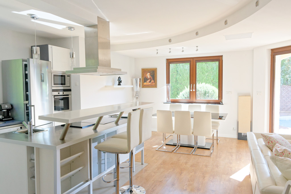 Dodatkowe udogodnienia: OGRZEWANY BASEN O ŚREDNICY 5,5 METRA, taras, garaż w bryle budynku, balkon, automatyczne rolety w oknach
