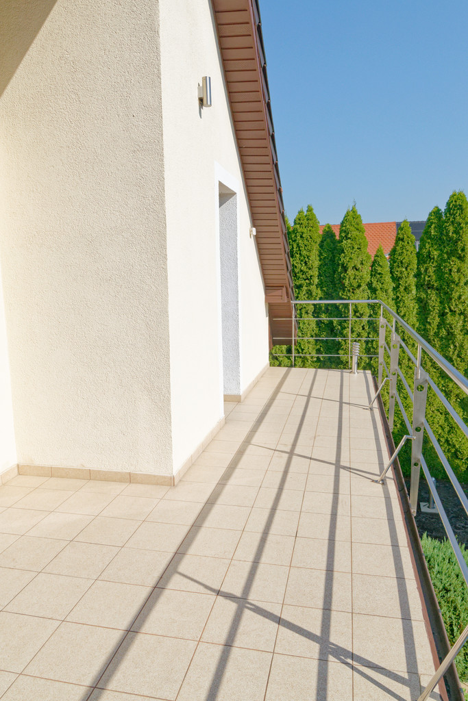 Podjazd z drogi asfaltowej bezpośrednio na teren działki wyłożonej kostką w kolorystyce i estetyce domu jest atrakcyjny dla oka, tą samą kostką wyłożone są ścieżki wokół domu prowadzące do tarasu, ogrodu i altanki.