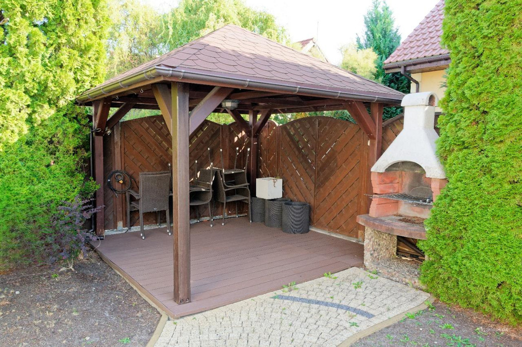 Dom ogrodzony jest drewnianym płotem oraz tują co zapewnia poczucie bezpieczeństwa i dyskrecji, wjazd do posiadłości wiedzie przez bramę automatyczną.