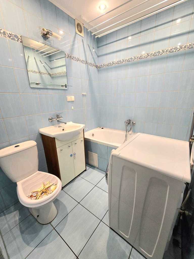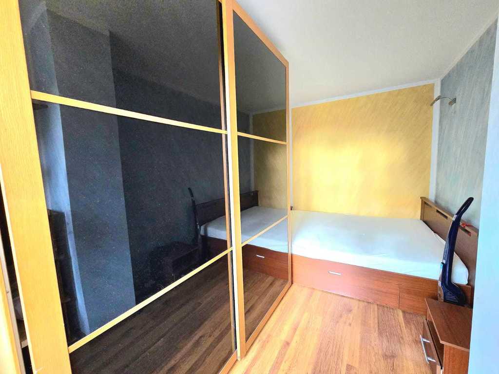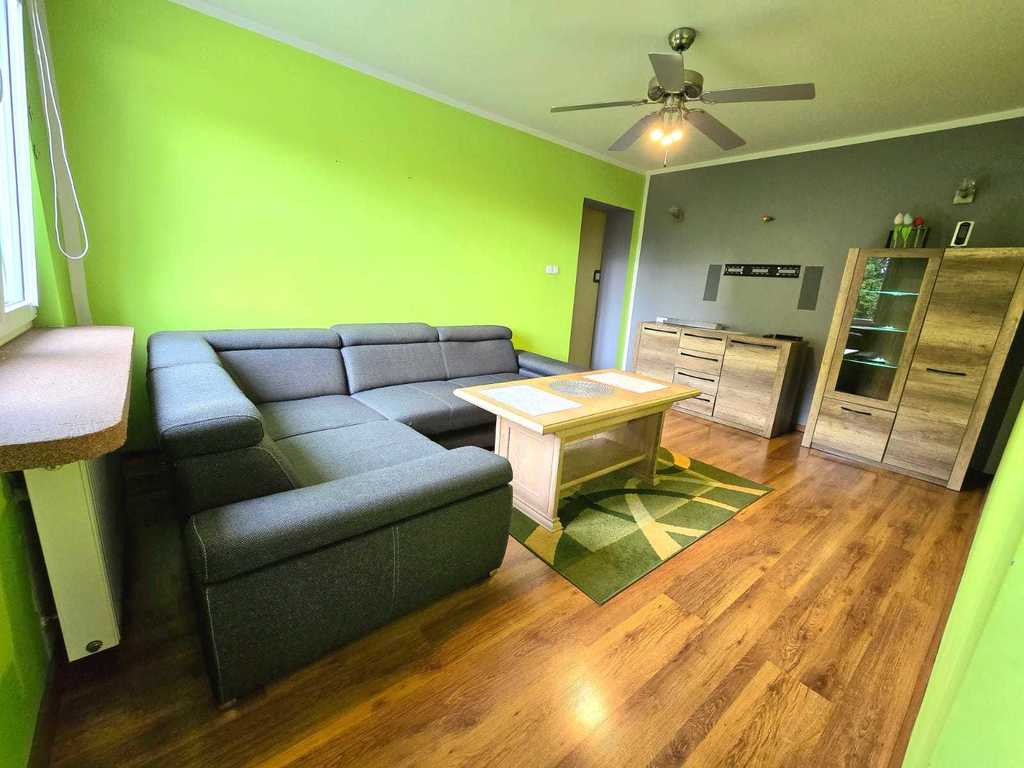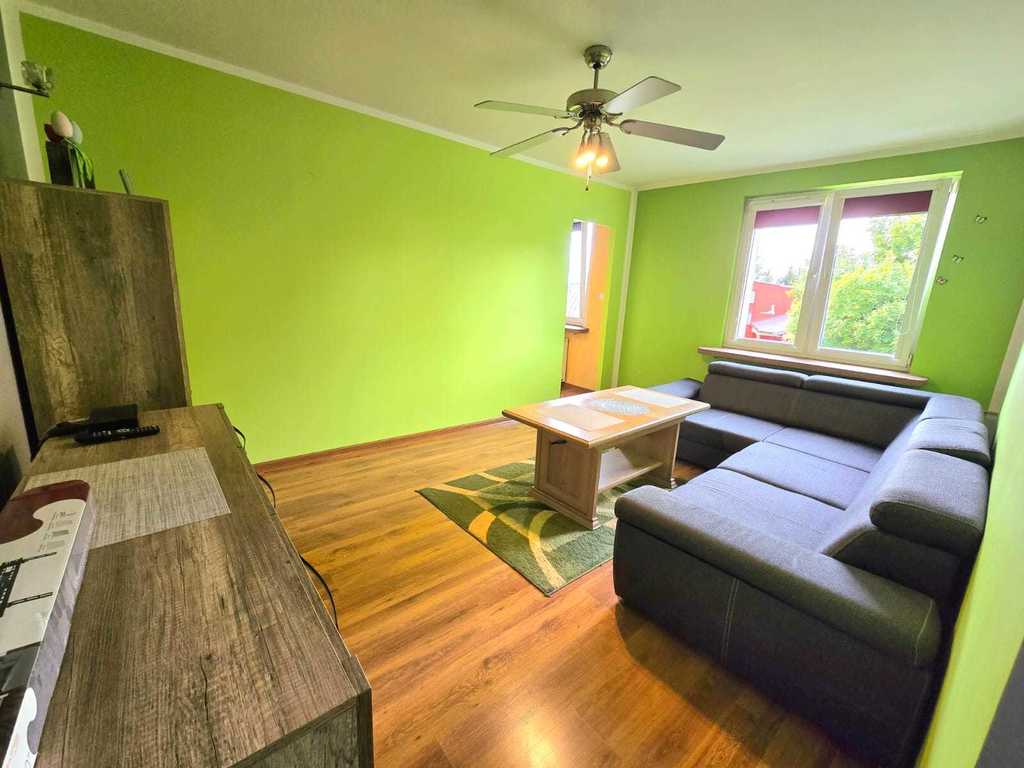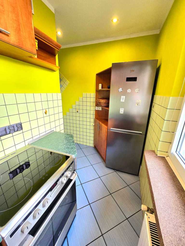Salon wyposażony jest w komfortowy narożnik oraz gustowne meble, tworząc przytulną przestrzeń do relaksu. Kuchnia posiada meble w zabudowie, kuchenkę elektryczną i lodówkę. W łazience znajduje się pralka. Mieszkanie przeszło gruntowny remont – wyrównano wszystkie ściany oraz wymieniono instalacje, co gwarantuje wysoki standard wykończenia. Dodatkowo, dzięki podziałowi dużego pokoju, uzyskano przytulną, dodatkową sypialnię, w której znajduje się duża, nowoczesna szafa oraz wygodne łóżko sypialniane.