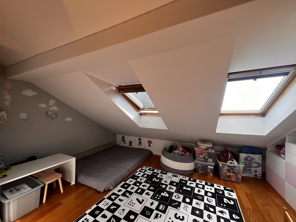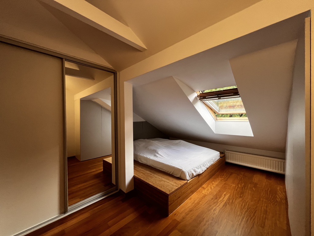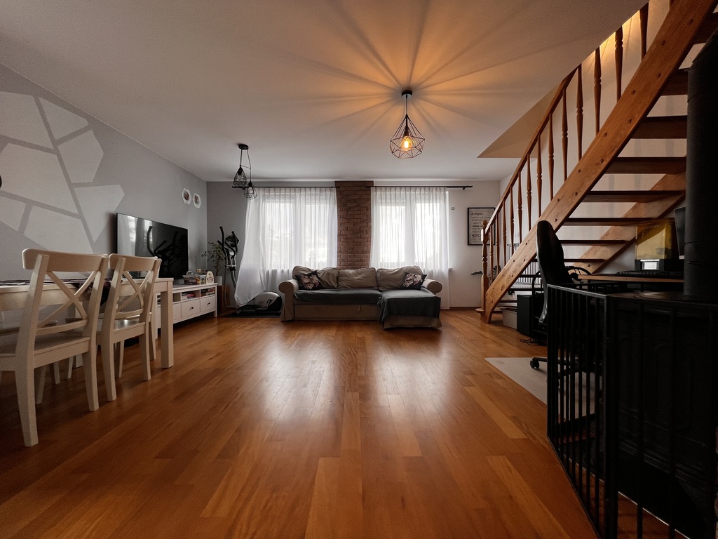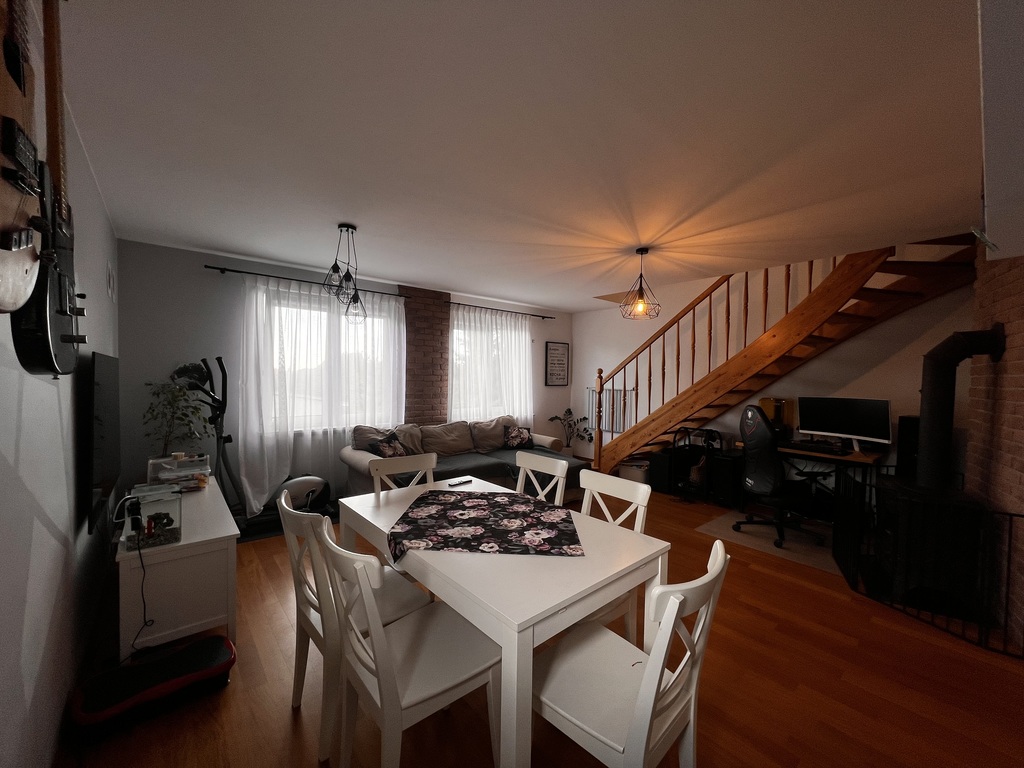 Pierwszy poziom nieruchomości składa się z funkcjonalnej i widnej kuchni z oknem i wyspą otwartej na duży, ustawny salon oraz łazienki z kabiną prysznicową i WC. Na piętrze, na które prowadzą drewniane schody, znajdują się dwie sypialnie oraz łazienka z wanną i WC. Mieszkanie jest widne i dobrze doświetlone poprzez trzystronną ekspozycję okien.