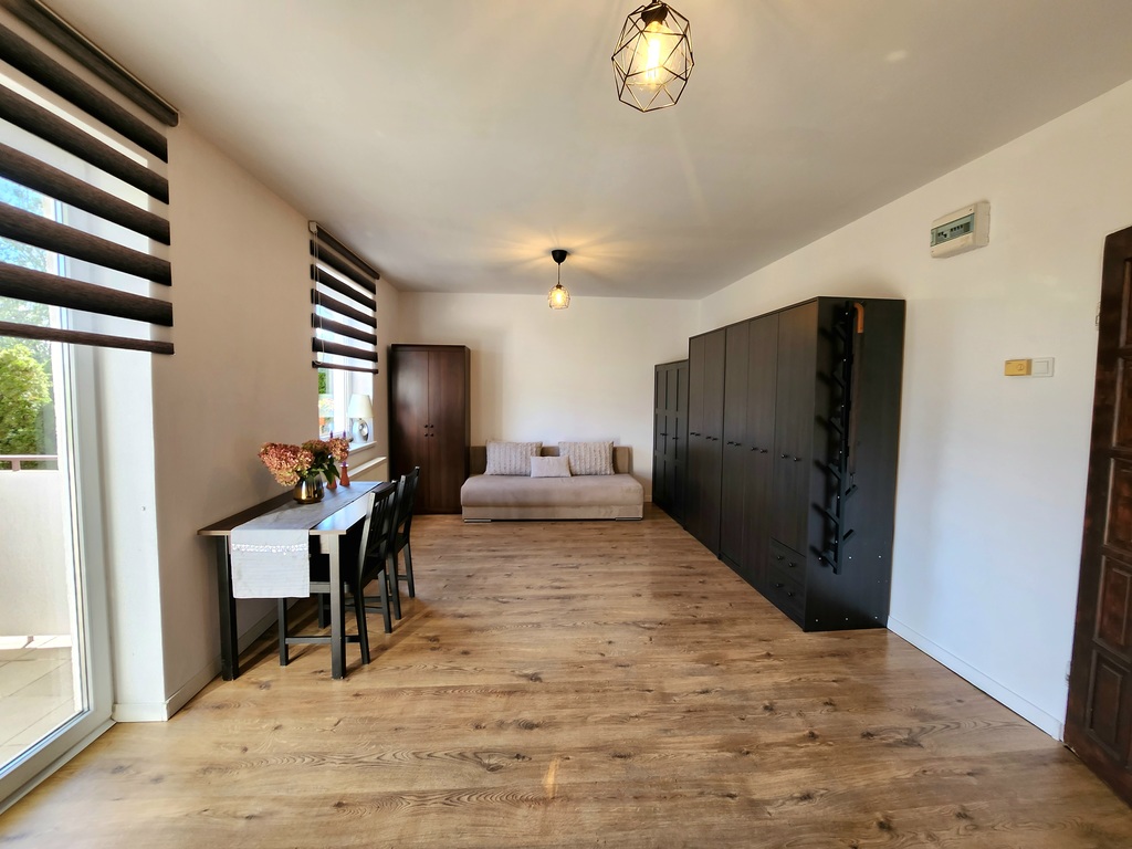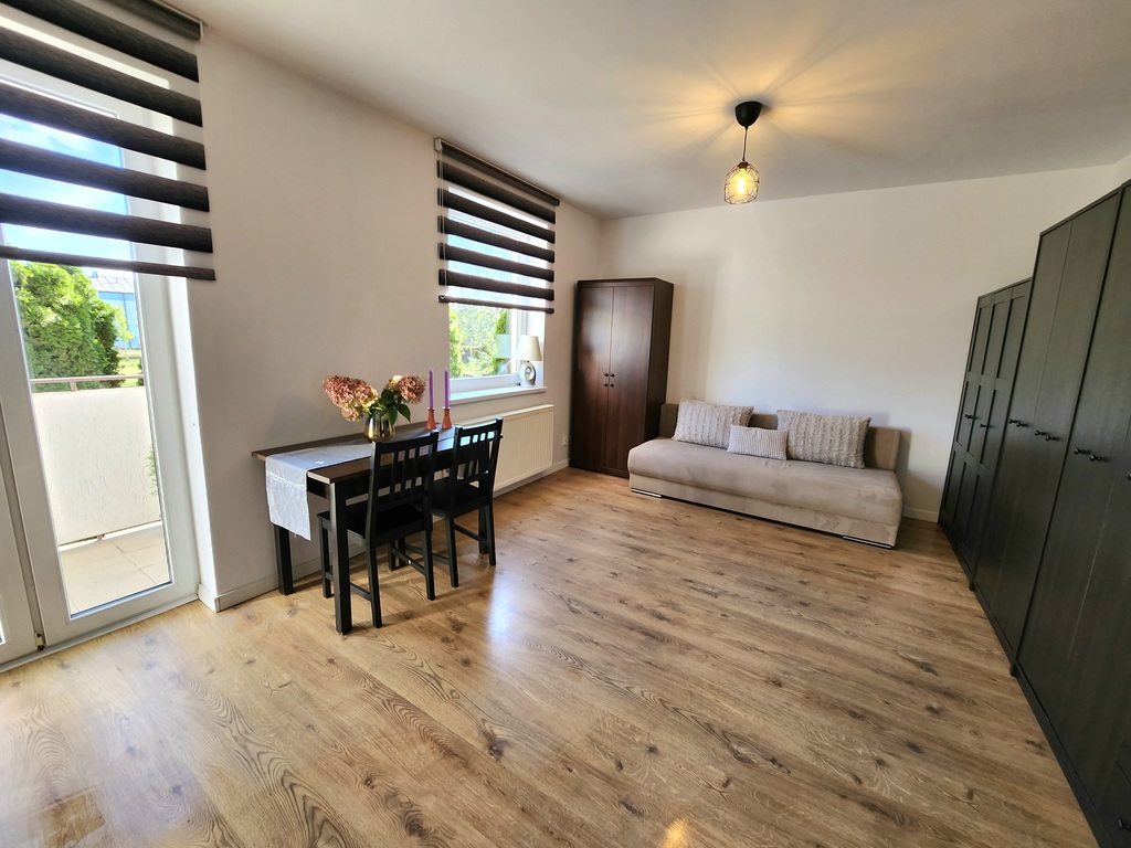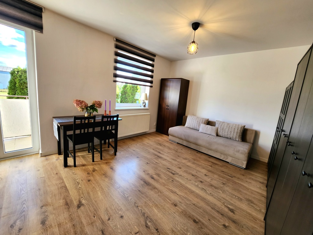 Oferujemy na wynajem przestronną kawalerkę znajdującą się na parterze niskiego bloku przy ulicy Kasjopei w Szczecinie. Na powierzchnie 35m2 składają się przestronny salon z wyjściem na balkon, aneks kuchenny i łazienka. Standard mieszkania dobry, ściany zostały odświeżone, na podłogach panele, okna PCV. Do dyspozycji najemców pozostaje pełne umeblowanie oraz sprzęty AGD (lodówka, kuchenka i piekarnik, zmywarka, pralka) widoczne na załączonych zdjęciach. Do mieszkania przynależna jest piwnica do użytku najemcy. Nieruchomość znajduje się na cichej i spokojnej dzielnicy niskich zabudowań, z pięknym widokiem na tereny zielone. W pobliżu znajdują się duże sklepy spożywcze (E Leclerc, Biedronka), apteka, pizzeria, fitness i przystanki autobusowe linii nr 57 i 89, które dojeżdżają do centrum w zaledwie 15 minut. Mieszkanie do wydania od zaraz. Miesięczne opłaty: 200,00 zł do wspólnoty, gaz, prąd i zimna woda według zużycia.