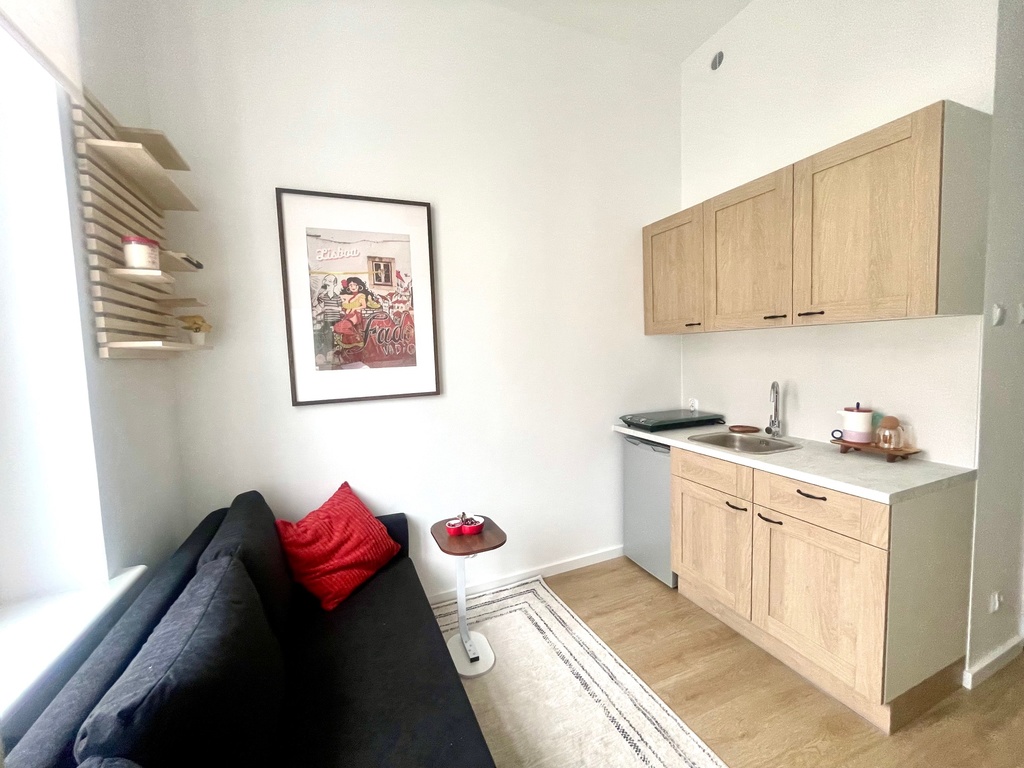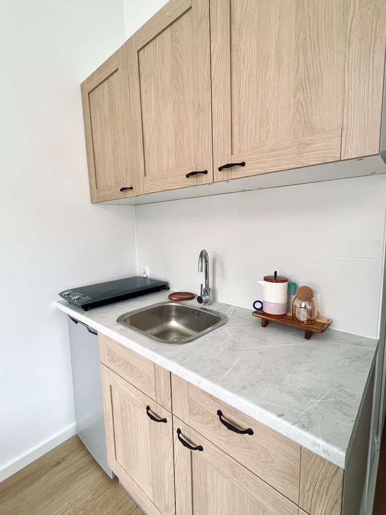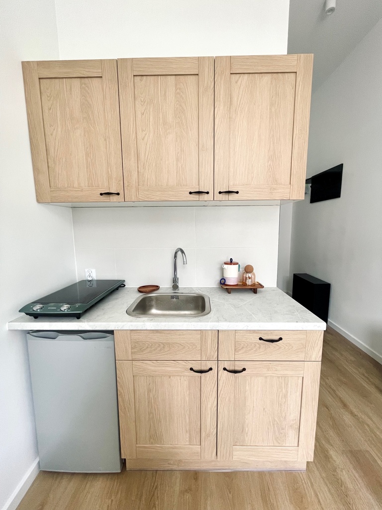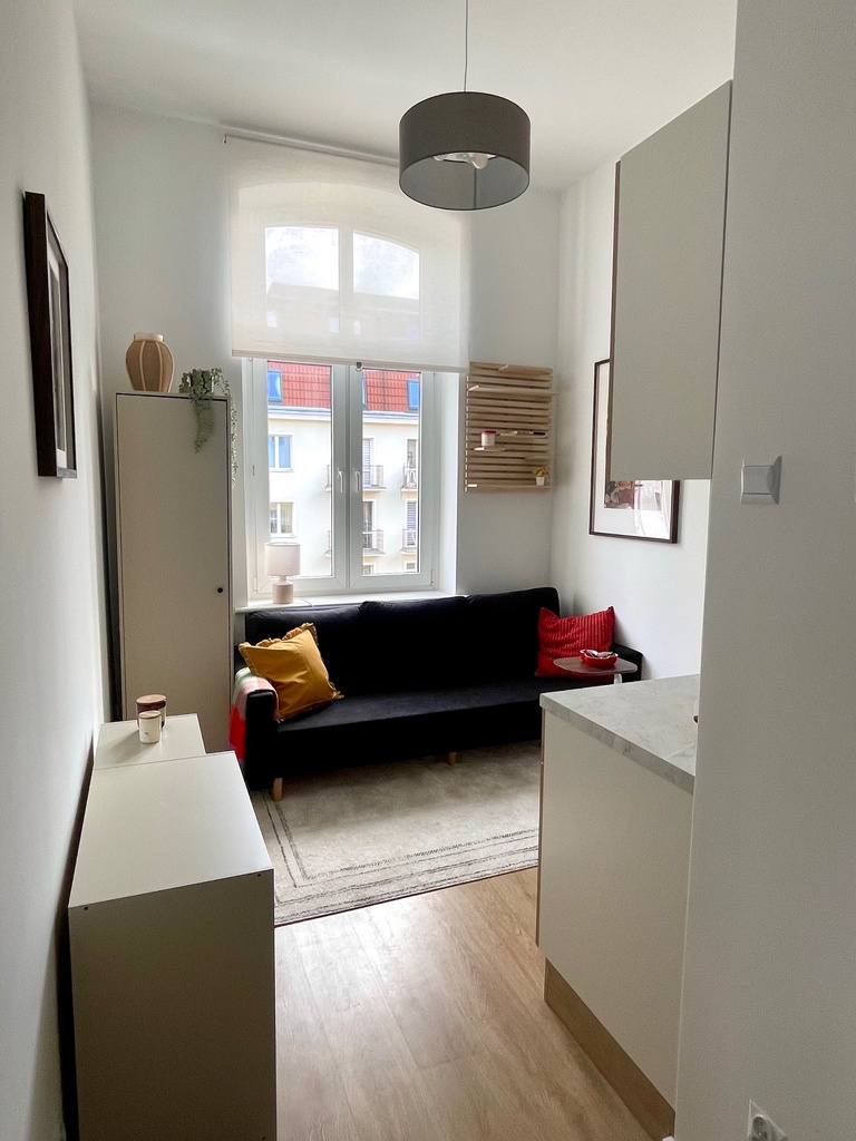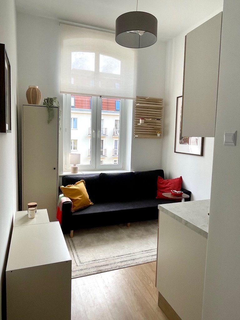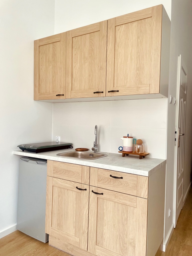 Mieszkanie w pełni wyposażone , aneks z meblami na wymiar i sprzętem AGD ( płyta grzewcza elektryczna , lodówka) pozostaje w cenie mieszkania.