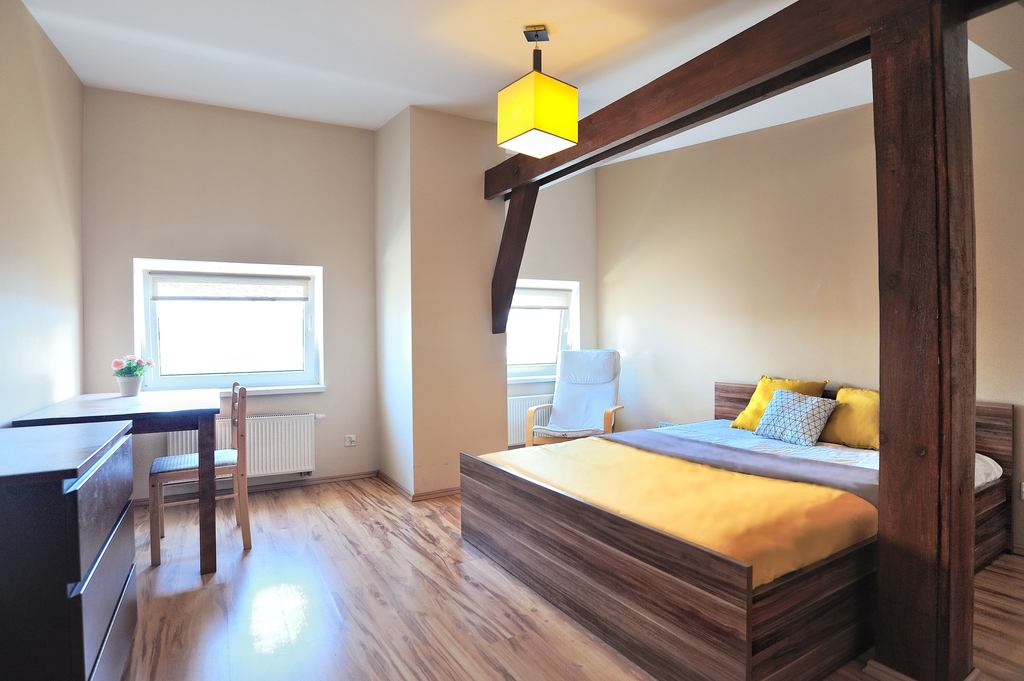 W pokoju znajduje się wygodne sypialniane łóżko, biurko, pojemna szafa i komoda.