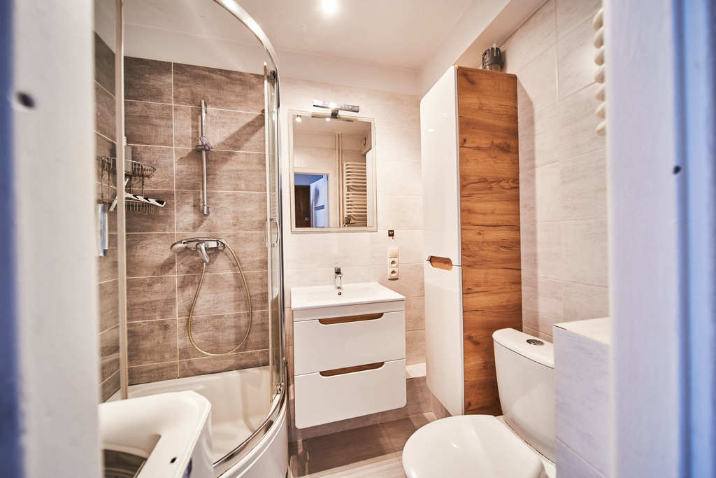 Łazienka: Razem z WC, wyposażona w kabinę prysznicową, umeblowanie oraz pralka w cenie