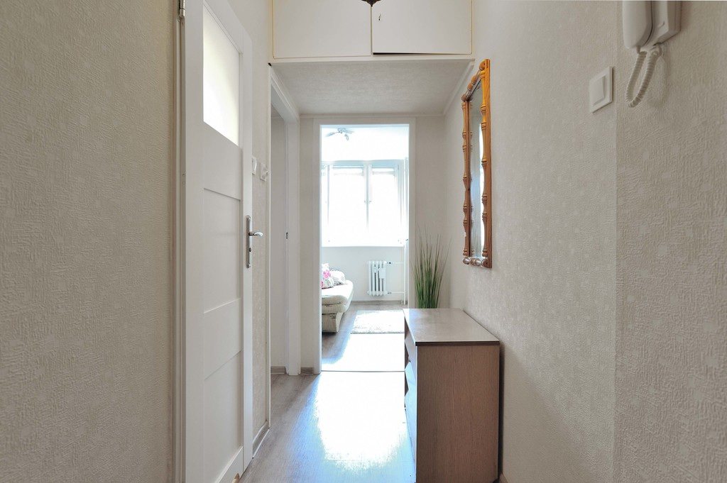 OPIS MIESZKANIA: Do wynajęcia 2-pokojowe mieszkanie znajdujące się na trzecim piętrze 8-piętrowego bloku. Jego całkowita powierzchnia wynosi 34,98 m2, jest w pełni umeblowane i wyposażone. Ogrzewanie jest z sieci miejskiej. a ciepła woda - z pieca gazowego. W mieszkaniu znajduje się salon z aneksem kuchennym, sypialnia, łazienka z WC oraz przedpokój. Wejście do mieszkania przez przedpokój z wieszakiem na ubrania i szafką na obuwie. Łazienka wyposażona jest w wannę, pralkę, WC, umywalkę z szafką w zabudowie. Kuchnia umeblowana jest w meble oraz wyposażona w sprzęt AGD - lodówkę z zamrażalnikiem, kuchenkę gazową z piekarnikiem elektrycznym, czajnik, mikrofalówkę. W salonie jest kanapa, stół, dwie szafy, dwa regały oraz komoda, na której stoi telewizor. Wydzielono tu także część jadalnianą za pomocą stołu i czterech krzeseł. Sypialnia z kolei jest umeblowana w kanapę i dużą szafę na ubrania.