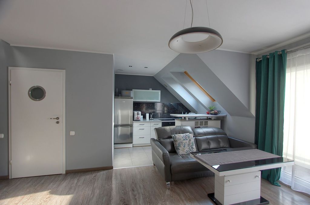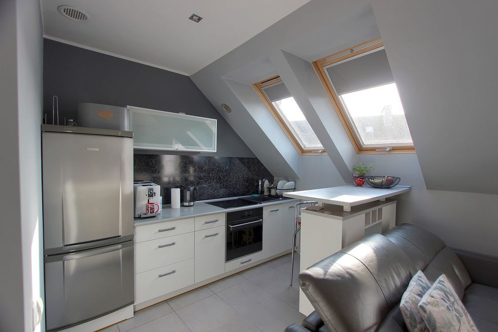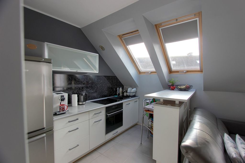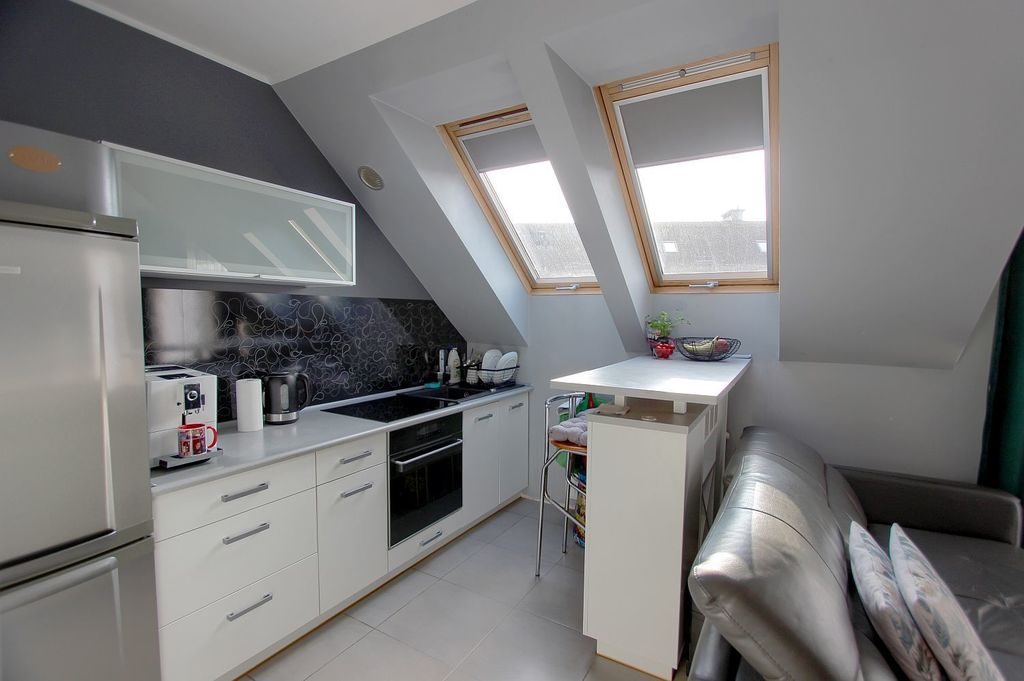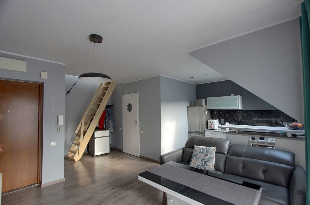 Na I poziomie znajduje się salon z wyjściem na balkon, aneks kuchenny oraz łazienka z wc i kabiną prysznicową.