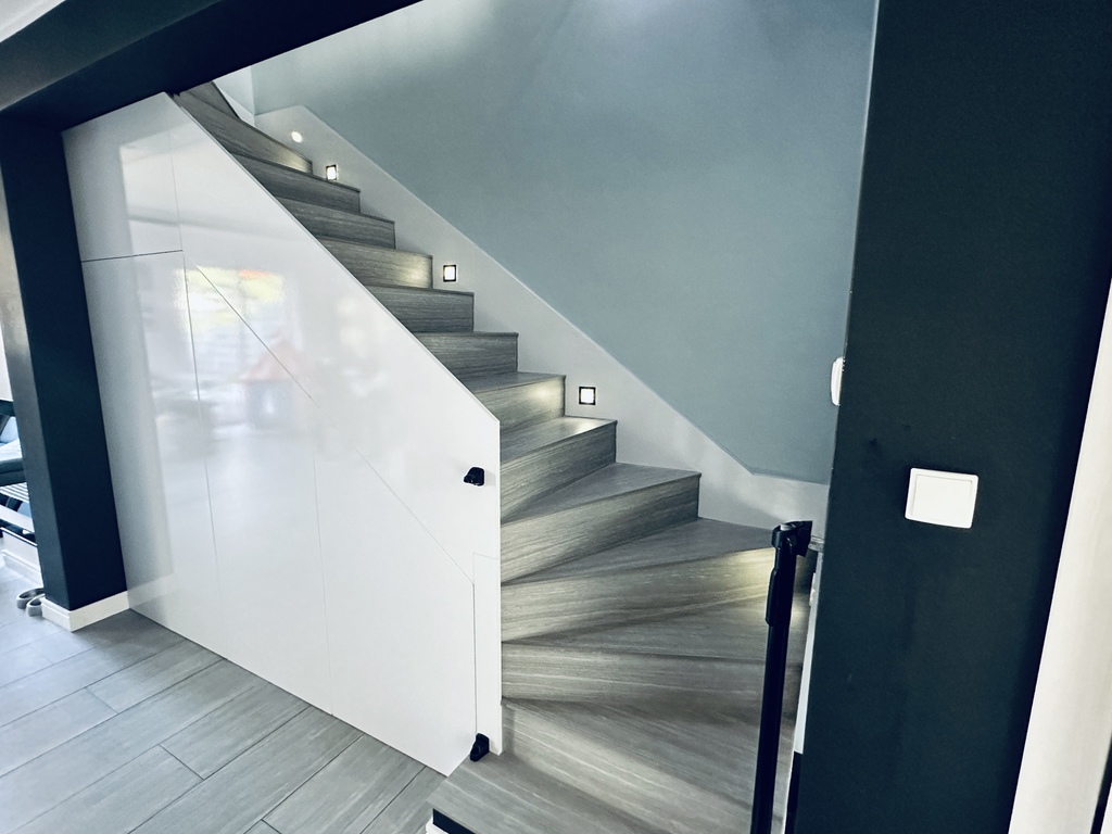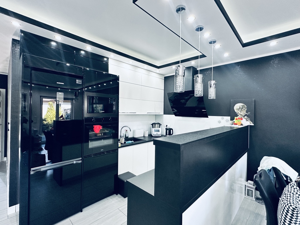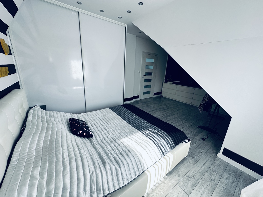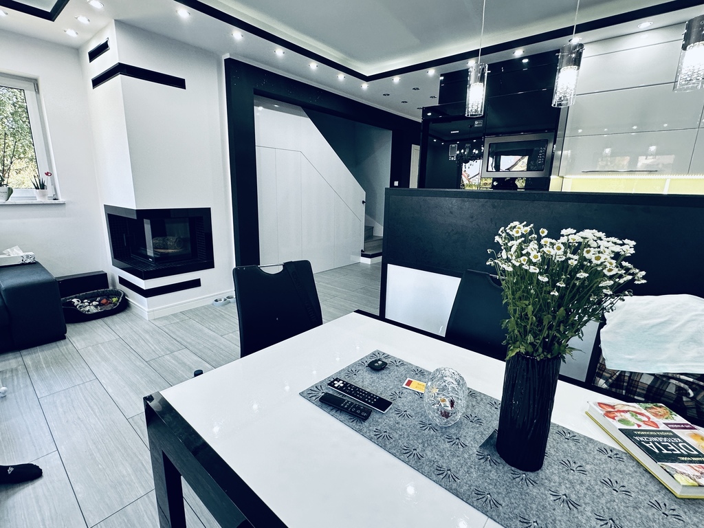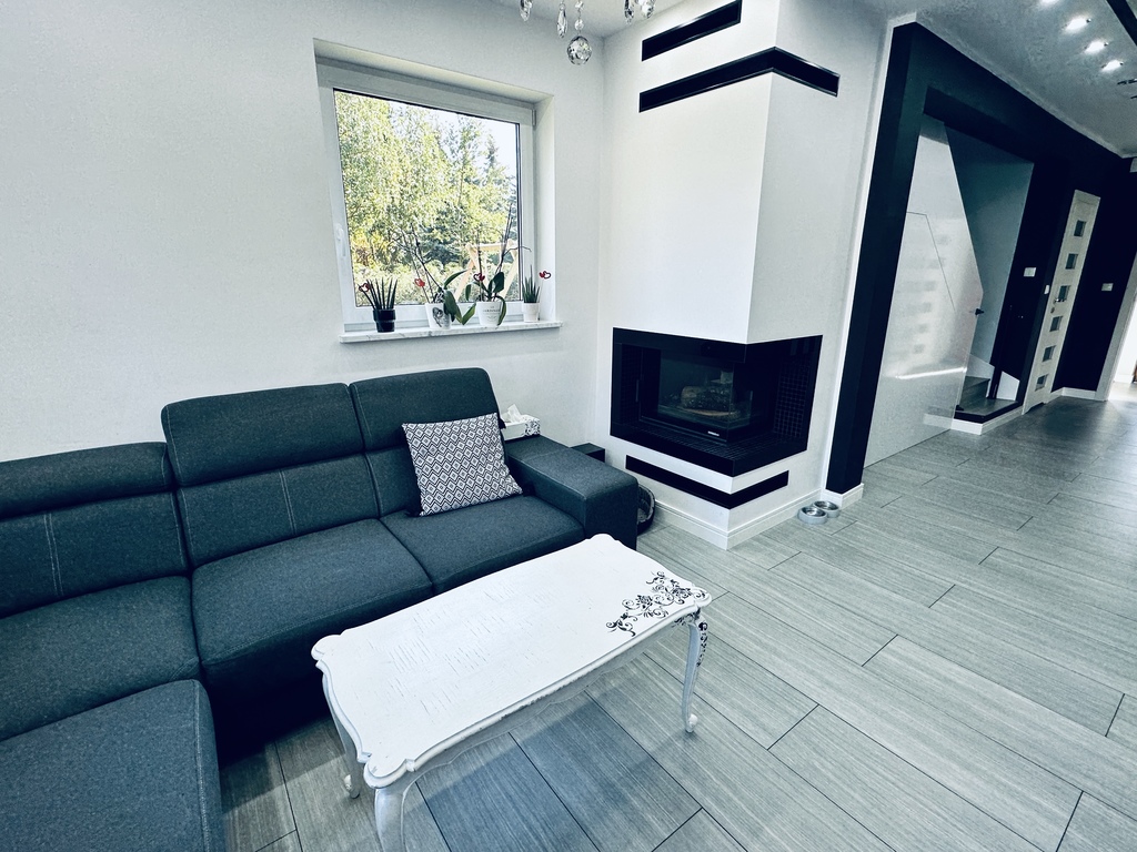 Dom wykończony w wysokim standardzie w 2018 roku, gotowy do zamieszkania, w pełni umeblowany na wymiar (wszystkie meble zawarte w cenie). Składa się z parteru, pierwszego piętra oraz poddasza. W bryle budynku znajduje się garaż, a przed nim dodatkowe miejsce postojowe.